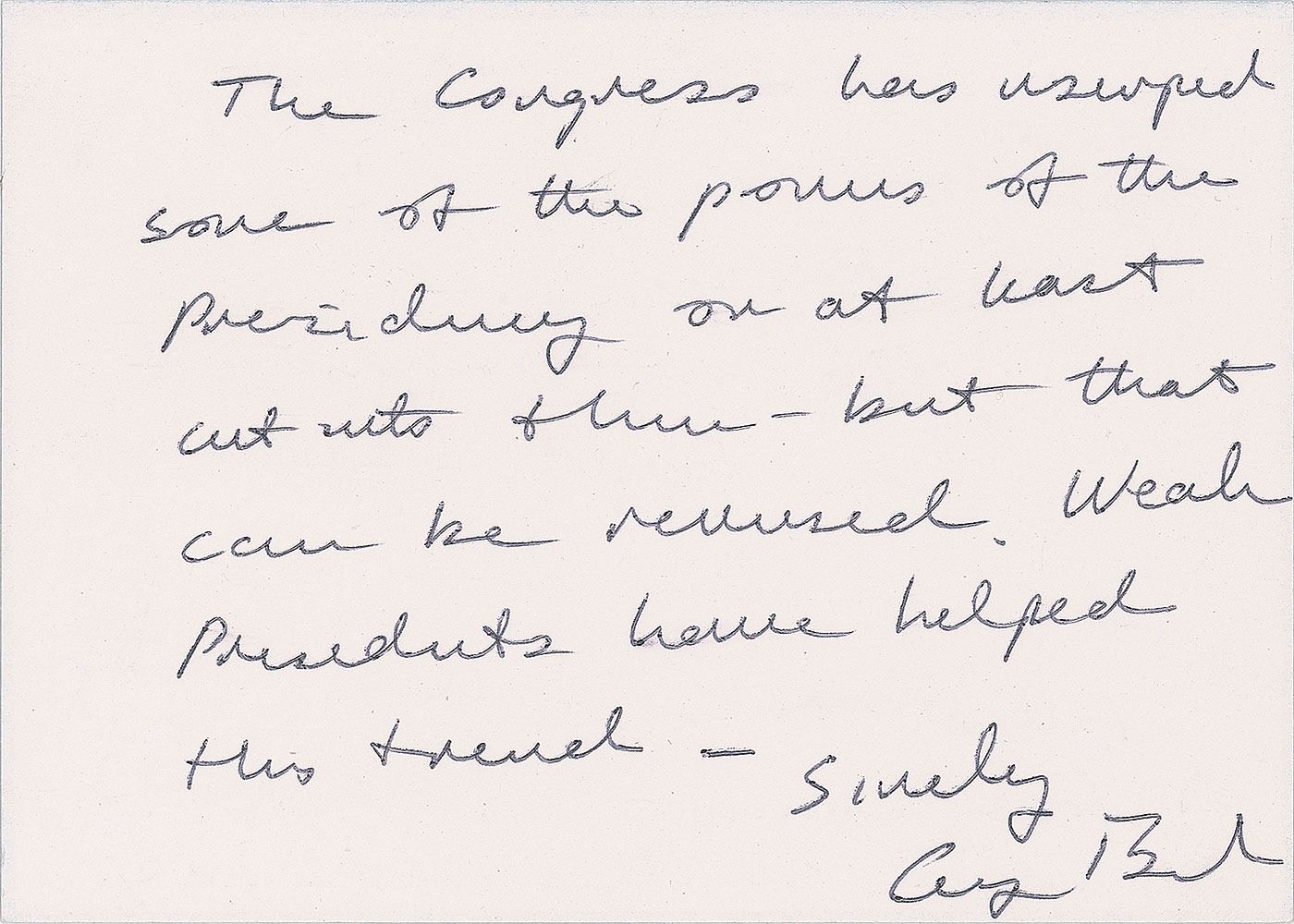 ALS, one page both sides, 6.25 x 4.5, personal letterhead, September 23, 1979. Letter to Ron Wade, in full: "The first President I met was Dwight Eisenhower. I met him with my father then a U.S. Senator from Conn—a simple hand shake was all. The Congress has usurped some of the powers of the presidency or at least cut into them—but that can be reversed. Weak Presidents have helped this trend." In fine condition. Accompanied by the original transmittal envelope. Bush had announced his presidential candidacy in May, and at the RNC in 1980 was named the candidate for vice president. The Reagan-Bush ticket handily defeated the incumbent President Carter, who Bush alludes to with his jab in the final sentence of this letter. The recipient, Ron Wade, was a floor leader at the 1988 Republican National Convention and was later appointed by Bush to his Presidential Inaugural Committee. He served as the regional director for Bush's campaign races in 1980, 1988, and 1992.