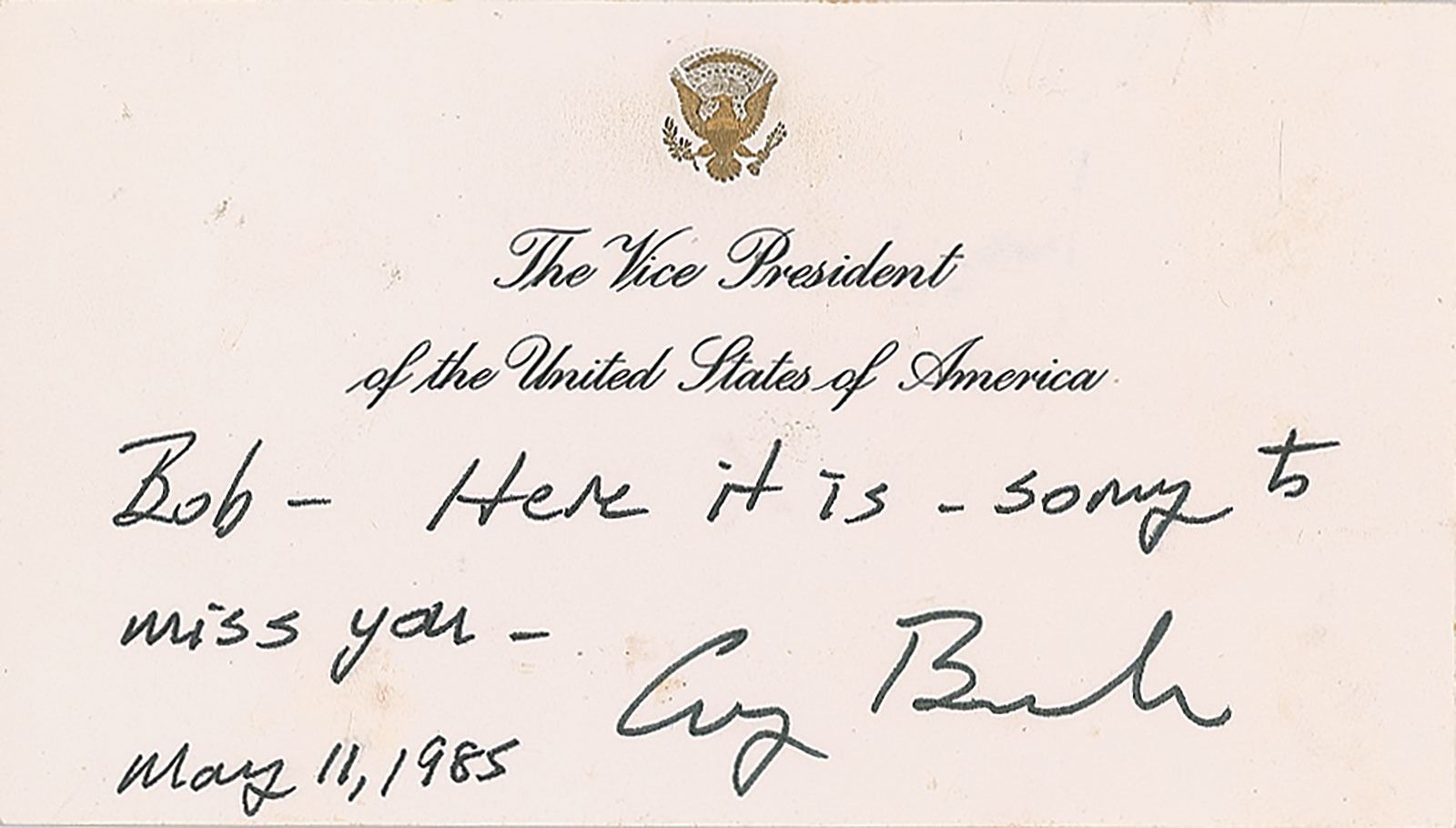 ALS as vice president, one page, 6.25 x 3.5, Vice President stationery card, May 11, 1985. In full: "Bob—Here it is—sorry to miss you—George Bush." In fine condition, with some light soiling and an old mounting remnant on the back. Accompanied by a vice presidential calling card.