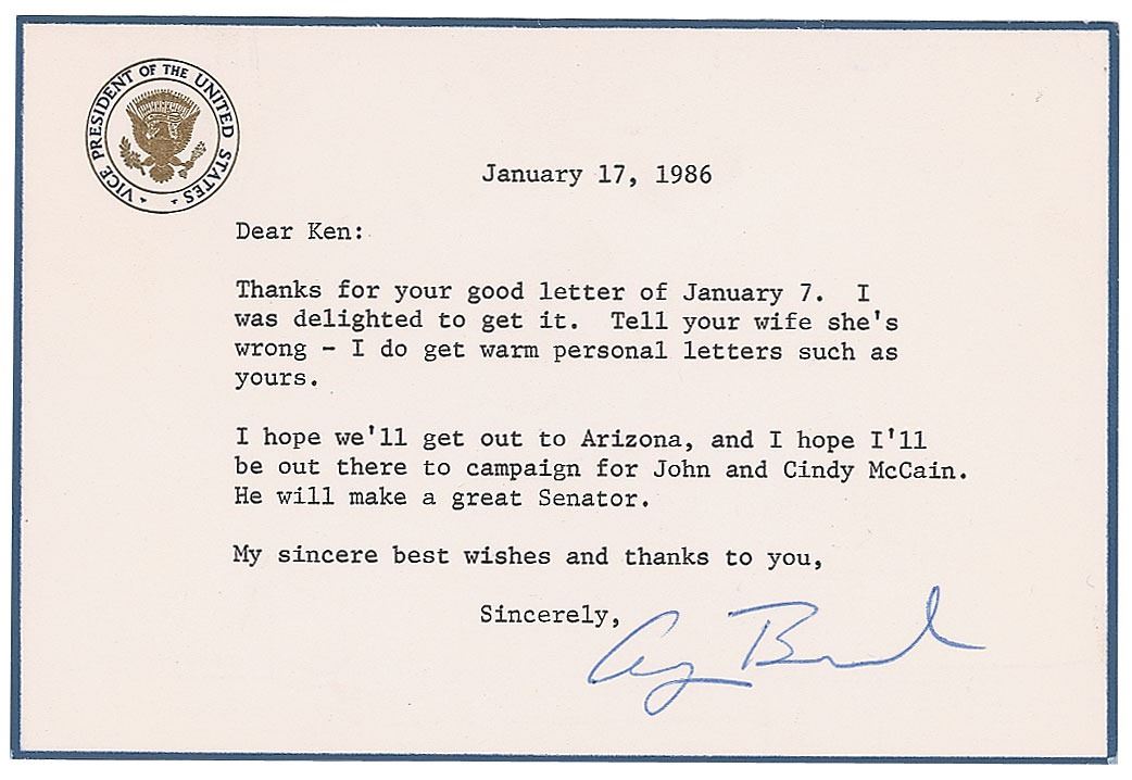 TLS, one page, 6.25 x 4.25, vice presidential letterhead, January 17, 1986. Letter to Ken Browne in Mesa, Arizona, in part: "Tell your wife she's wrong—I do get warm personal letters such as yours. I hope we'll get out to Arizona, and I hope I'll be out there to campaign for John and Cindy McCain. He will make a great Senator." In fine condition. Accompanied by the original mailing envelope.