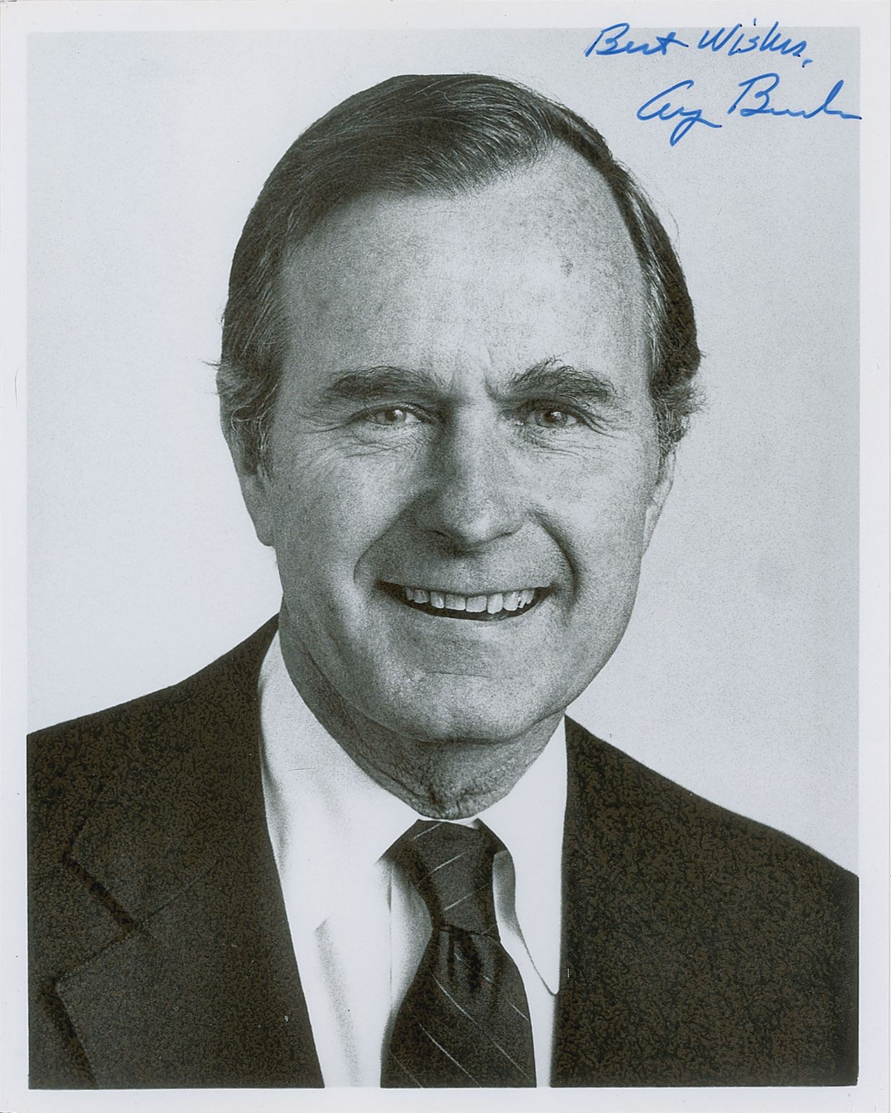 Glossy 8 x 10 head-and-shoulders photo of Bush in a suit and tie, signed in blue felt tip, "Best wishes, George Bush." In fine condition, with scattered small surface creases.