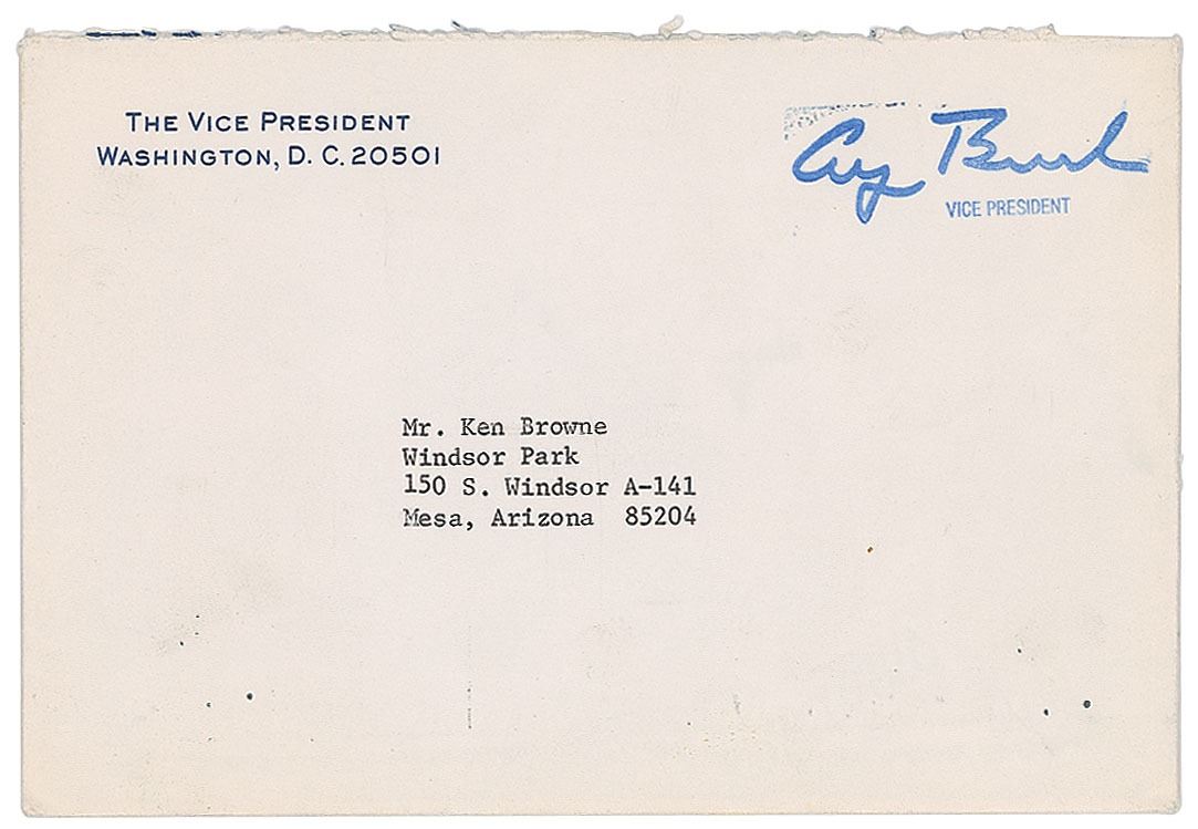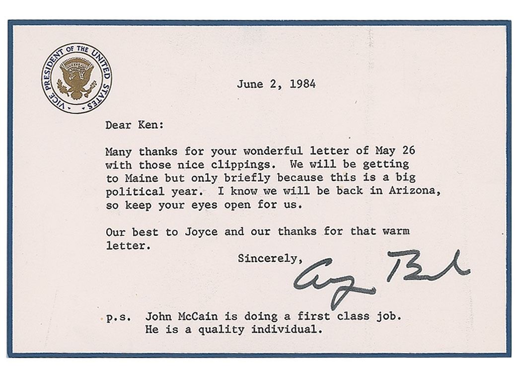 TLS, one page, 6.25 x 4.25, vice presidential letterhead, June 2, 1984. Letter to Ken Browne in Mesa, Arizona, in part: "We will be getting to Maine but only briefly because this is a big political year. I know we will be back in Arizona so keep your eyes open for us…P.S. John McCain is doing a first class job. He is a quality individual." In fine condition. Accompanied by the original mailing envelope.