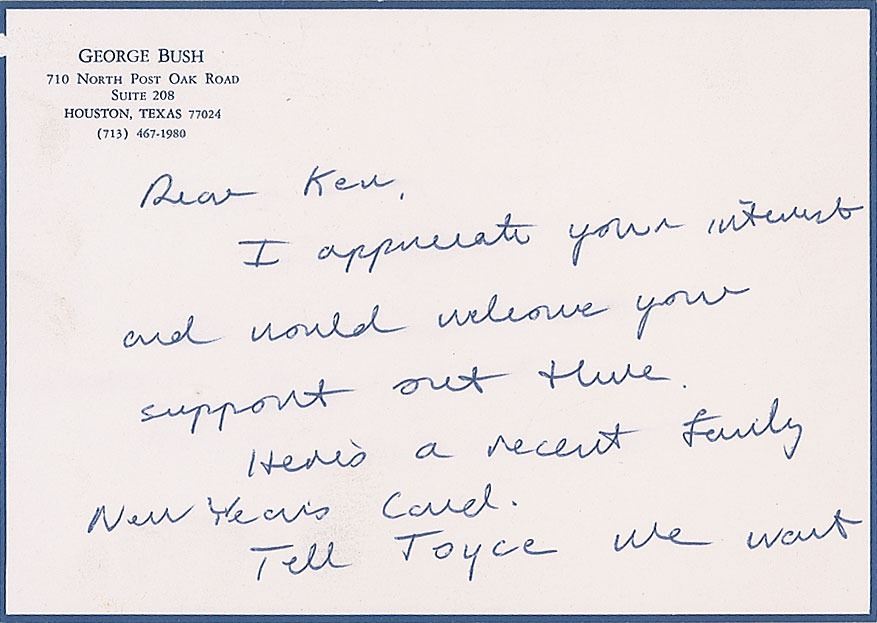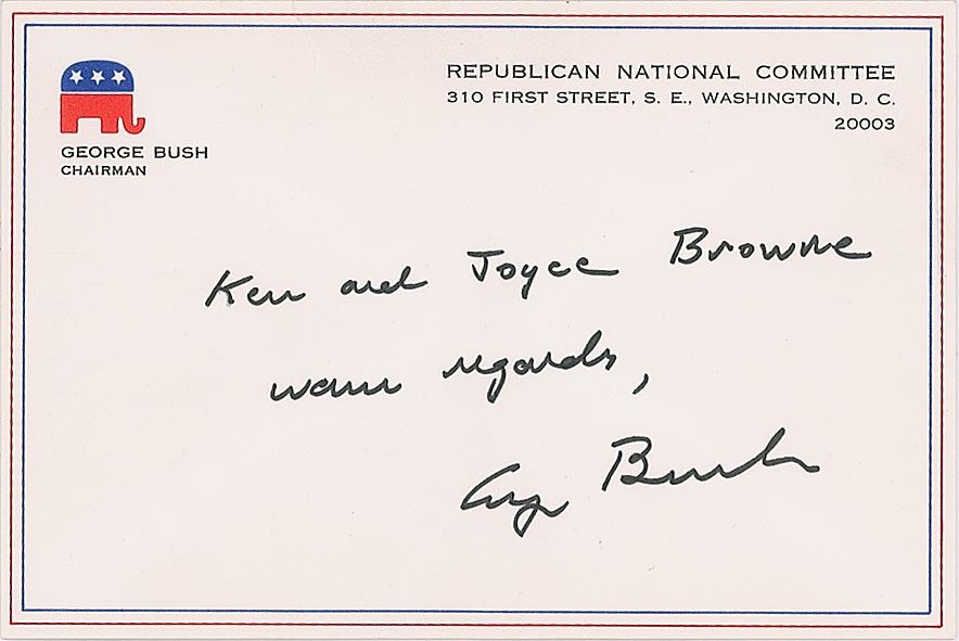 Two items: an ALS signed "George Bush," one page on a 6.5 x 4.5 personal stationery card, in part, "I appreciate your interest and would welcome you support out there. Here's a recent family New Year's card. Tell Joyce we want her help too"; and a felt tip signature and inscription, "Ken and Joyce Browne, warm regards, George Bush," on an off-white 6.5 x 4.5 Republican National Committee card. In fine condition.