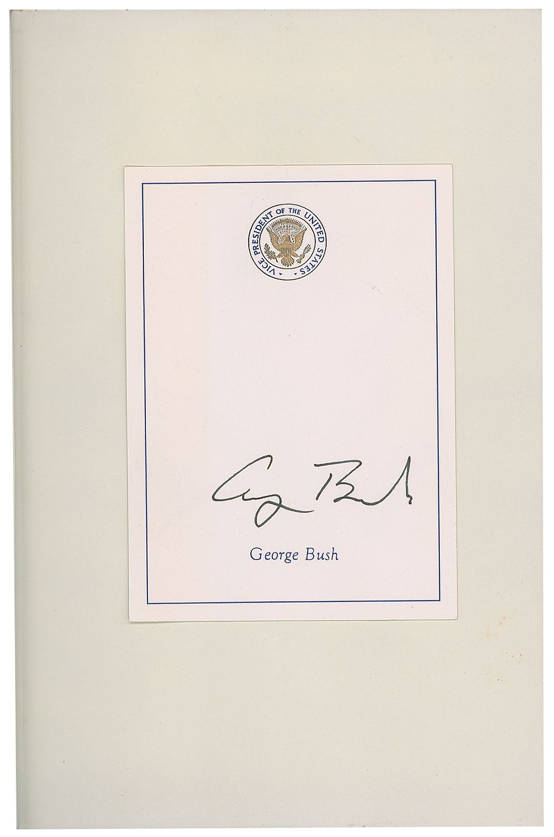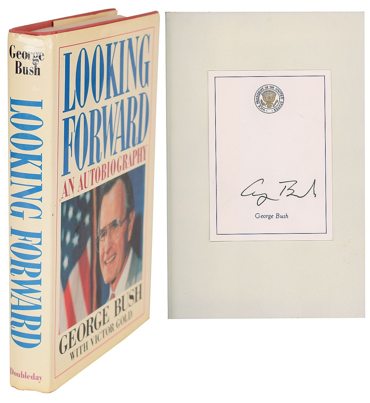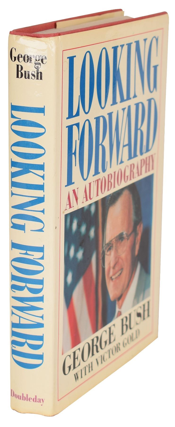 Signed book: Looking Forward: An Autobiography. First edition. NY: Doubleday, 1987. Hardcover with dust jacket, 6.5 x 9.5, 270 pages. Signed on a vice presidential bookplate affixed to the first free end page in black felt tip, "George Bush." In fine condition, with what appears to be an ownership signature on the title page.