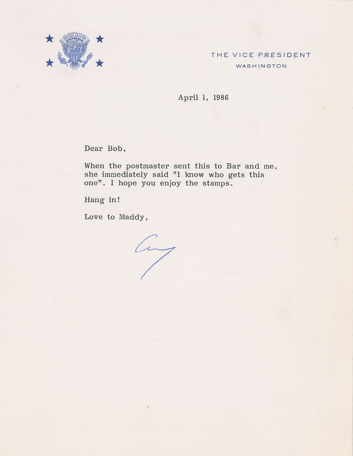 Two items: a TLS as vice president, signed "George," one page, 7 x 9, Vice President letterhead, April 1, 1986, addressed to his fishing buddy Robert A. Boilard, in full: "When the postmaster sent this to Bar and me, she immediately said ‘I know who gets this one.' I hope you enjoy the stamps. Hang in! Love to Maddy." Also included is a United States Postal Service presentation folder, 10.5 x 11.75, with front cover titled in gilt lettering, "Fish Booklet, Commemorative U.S. Postage Stamps, March 21, 1986” and “George Bush, Vice President of the United States." The interior features an affixed FDC booklet commemorating 'Fish Booklet Stamps,' with adjacent side housing three rows of five-stamp blocks and an FDC with fish stamps and cachet honoring the Fish Booklet Pane. In fine condition. An impressive item given that, for a short time, this exclusive stamp folder belonged to Vice President Bush before he forwarded it to his close friend and fishing buddy. A famous fisherman, the elder Bush enjoyed casting his line for striped bass and blues off of his compound in Kennebunkport, Maine. As vice president, he played a key role in passing amendments to the Sportfish Restoration Act, and during his presidency he established 56 wildlife refuges.