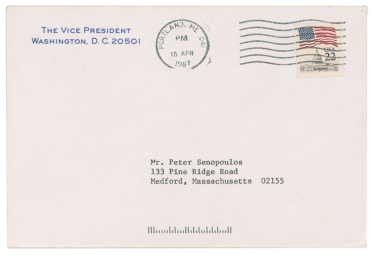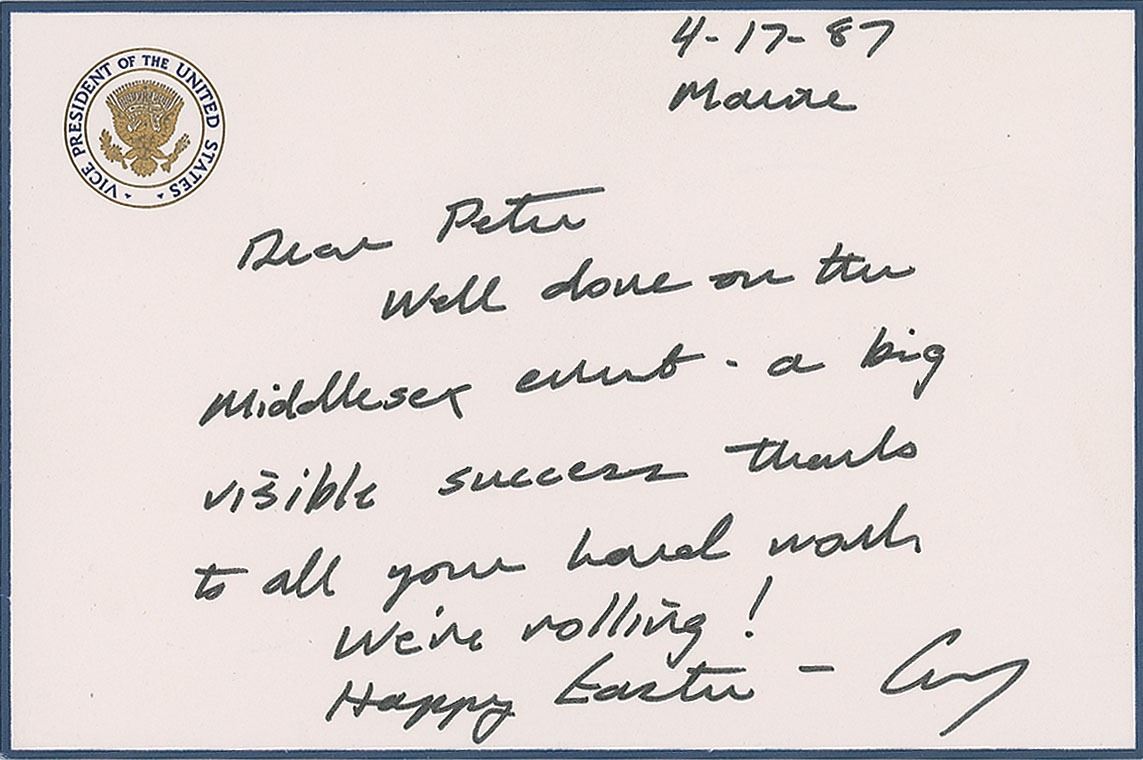 ALS signed “George,” one page, 6.5 x 4.25, vice presidential letterhead, April 17, 1987. Letter to Peter Senopoulos, written from Maine, in full: "Well done on the Middlesex event—a big visible success thanks to all your hard work. We're rolling! Happy Easter." In very fine condition. Accompanied by the original mailing envelope.