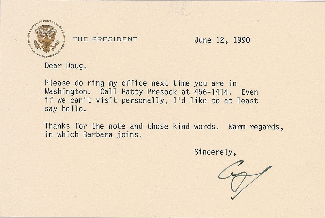 TLS as president signed “George,” one page, 6.5 x 4.25, The President letterhead, June 12, 1990. Letter to actor Douglas Fairbanks, Jr., in full: "Please do ring my office next time you are in Washington. Call Patty Presock at 456-1414. Even if we can't visit personally, I'd like to at least say hello. Thanks for the note and those kind words. Warm regards, in which Barbara joins." In fine condition, with some surface paper loss to the top edge. Accompanied by the original White House transmittal envelope.