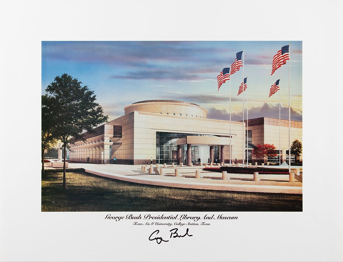 Color glossy 17 x 13 print of an artistic rendering of the George Bush Presidential Library and Museum at Texas A&M University, signed in the lower border in black felt tip by George Bush. In fine condition.