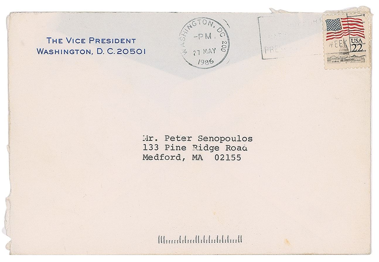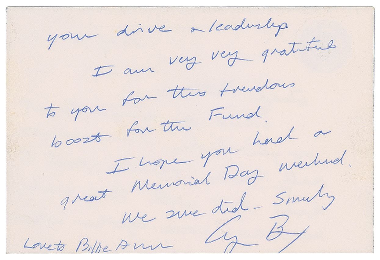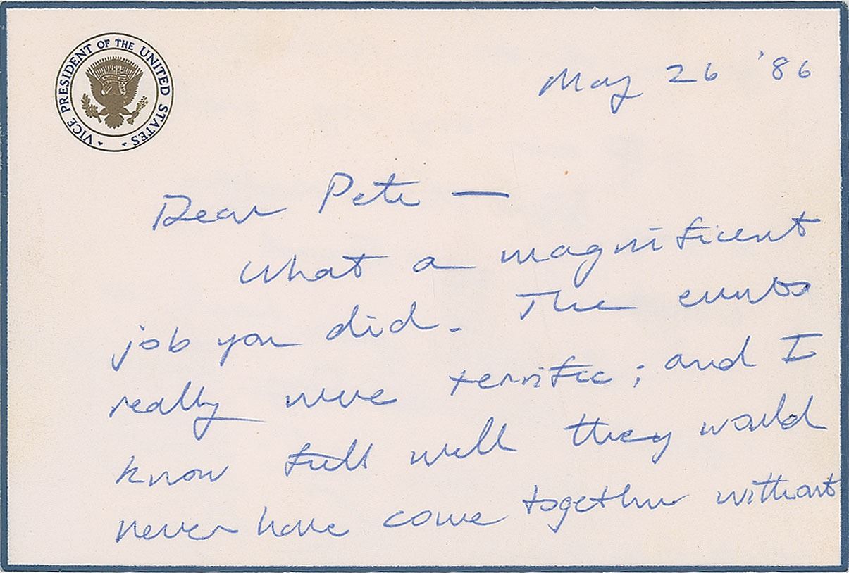 ALS as vice president on both sides of a 6.25 x 4.25 vice presidential card, May 26, 1986. Letter to Peter Senopoulos, in full: "What a magnificent job you did. The events really were terrific; and I know full well they would never have come together without your drive & leadership. I am very very grateful to you for this tremendous boost for the Fund. I hope you had a great Memorial Day weekend. We sure did." In very fine condition. Accompanied by the original mailing envelope.