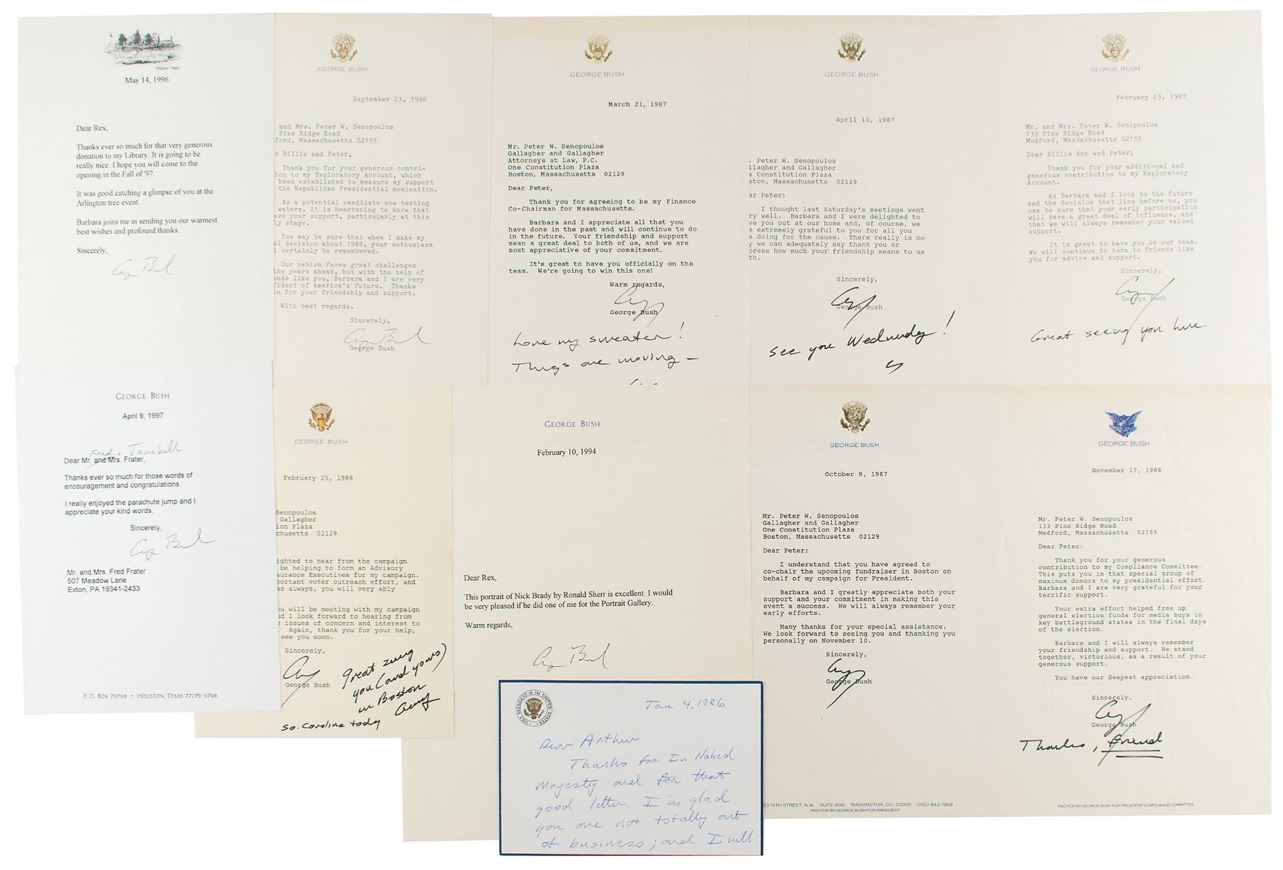 Collection of 11 letters by Bush, including one ALS and ten TLSs, all signed "George" or "George Bush," dating from 1986 to 1997, with eight written during his term as vice president. Several are to Peter Senopoulos, who aided in his presidential campaign. Bush adds short handwritten postscripts to five. Excerpts: