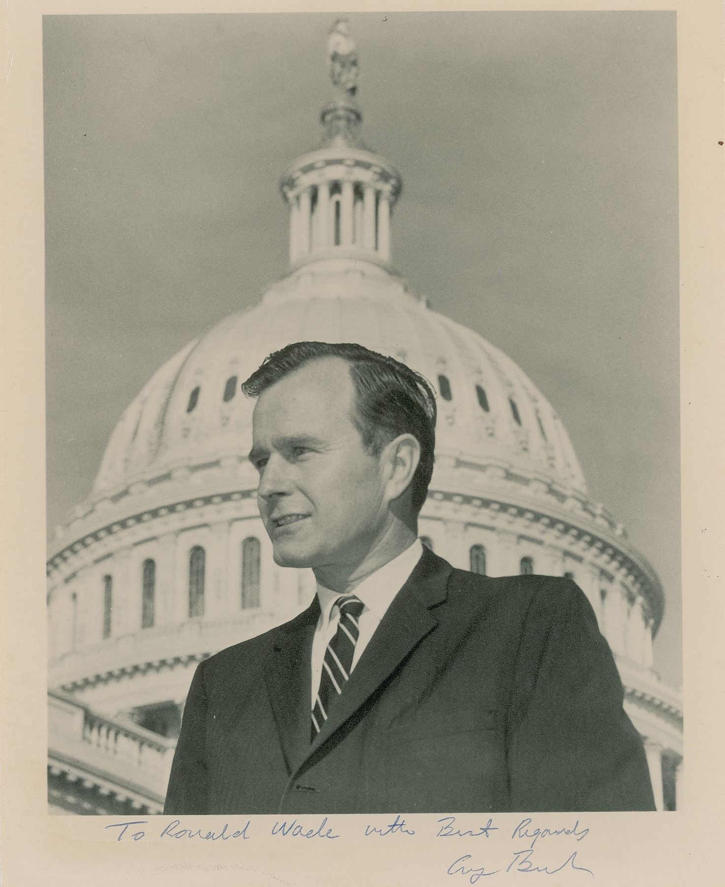 Matte-finish 8 x 9.75 photo of the Texas Congressman posing in front of the U.S. Capitol, signed and inscribed in the lower border in black ballpoint, "To Ronald Wade with best regards, George Bush.” In very fine condition. The recipient, Ron Wade, was a floor leader at the 1988 Republican National Convention and was later appointed by Bush to his Presidential Inaugural Committee. He served as the regional director for Bush's campaign races in 1980, 1988, and 1992.