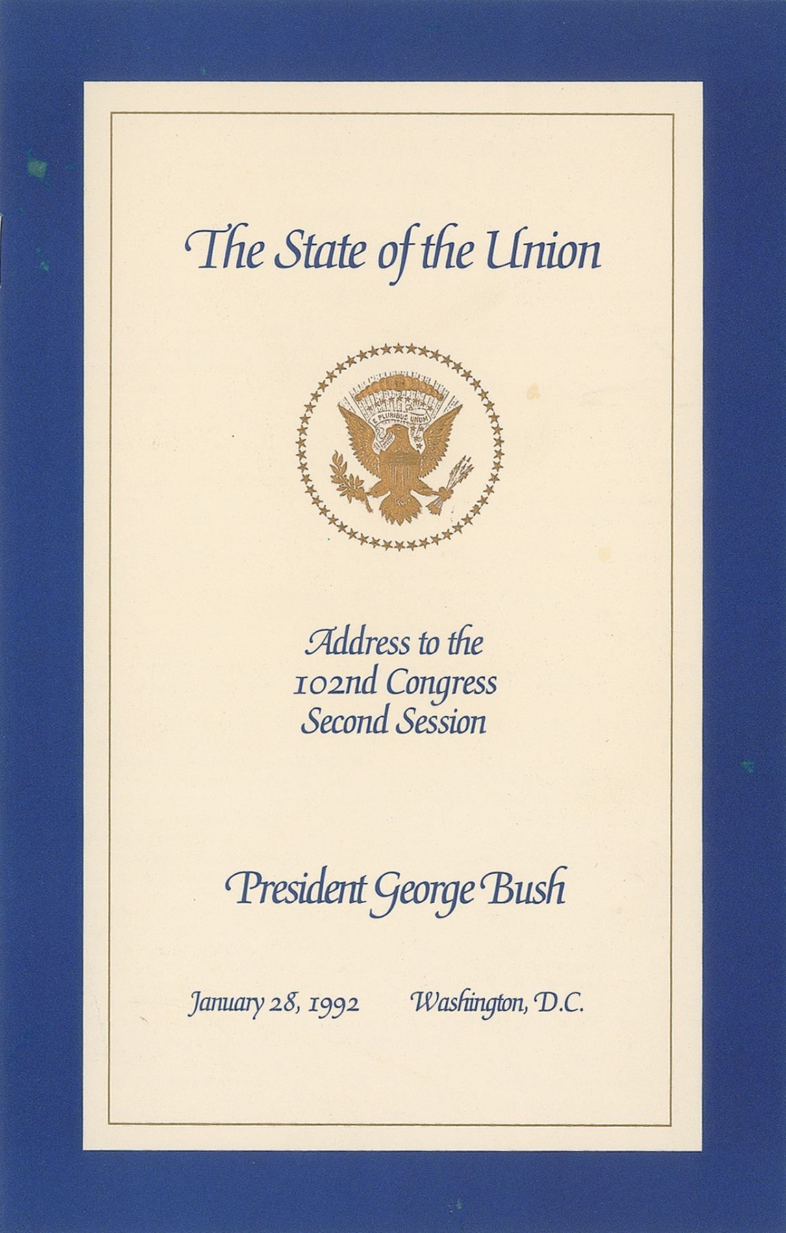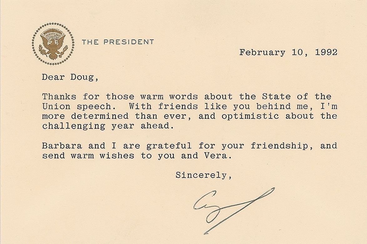 TLS as president signed “George,” one page, 6.25 x 4.25, The President letterhead, February 10, 1992. Letter to actor Douglas Fairbanks, Jr., in part: "Thanks for those warm words about the State of the Union speech. With friends like you behind me, I'm more determined than ever, and optimistic about the challenging year ahead." In fine condition. Accompanied by the original transmittal envelope, and an unsigned printed booklet of Bush's 1992 State of the Union Address.