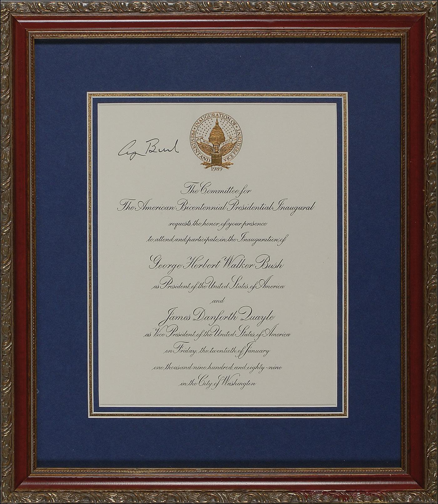 Engraved invitation to the 1989 Inauguration, 8.5 x 11, signed in the upper left in black ink by Bush. Triple matted and framed to an overall size of 14 x 16. In fine condition. Accompanied by a printed note from Bush’s Texas office transmitting the item for an auction. RRAuction COA.