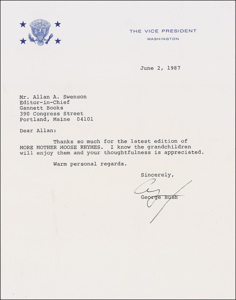 TLS signed “George,” one page, 7 x 9, Vice President letterhead, June 2, 1987. Letter to Allan Swanson, Editor-in-Chief of Gannett Books. In full: “Thanks so much for the latest edition of More Mother Goose Rhymes. I know the grandchildren will enjoy them and your thoughtfulness is appreciated.” In fine condition. RRAuction COA.