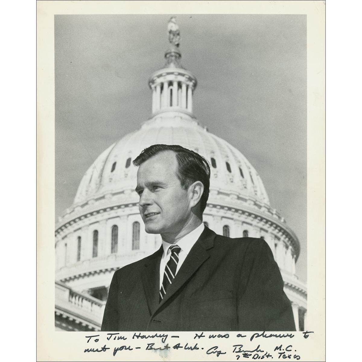 Early matte-finish 8 x 10 photo of a young Congressman Bush standing in front of the US Capitol, signed and inscribed in black felt tip “To Jim Harvey—it was a pleasure to meet you—Best of luck, George Bush, M.C. 7th Dist. Texas.” In fine condition, with few corner creases, a strip of toning along left edge, and a brush to the word “Best.”