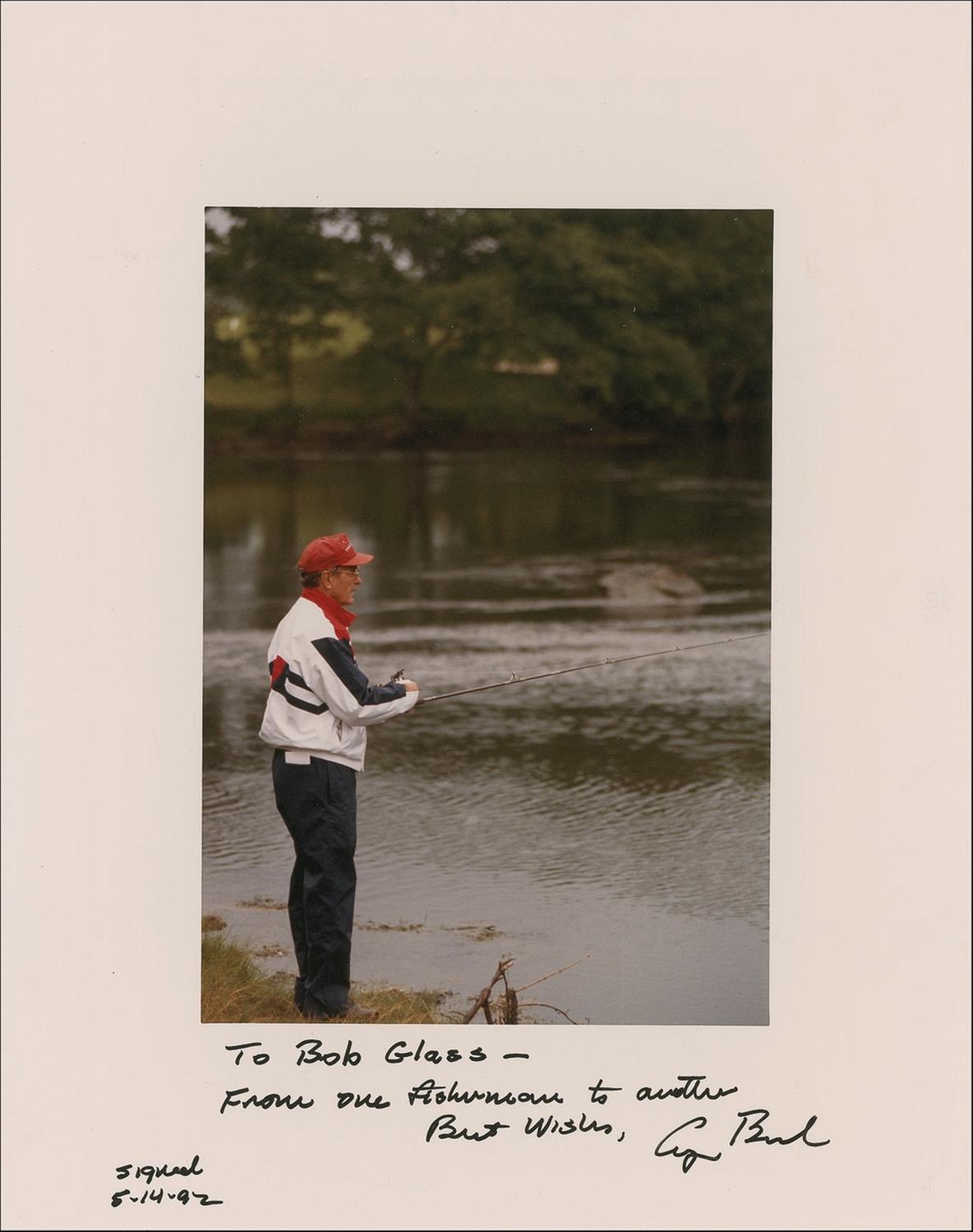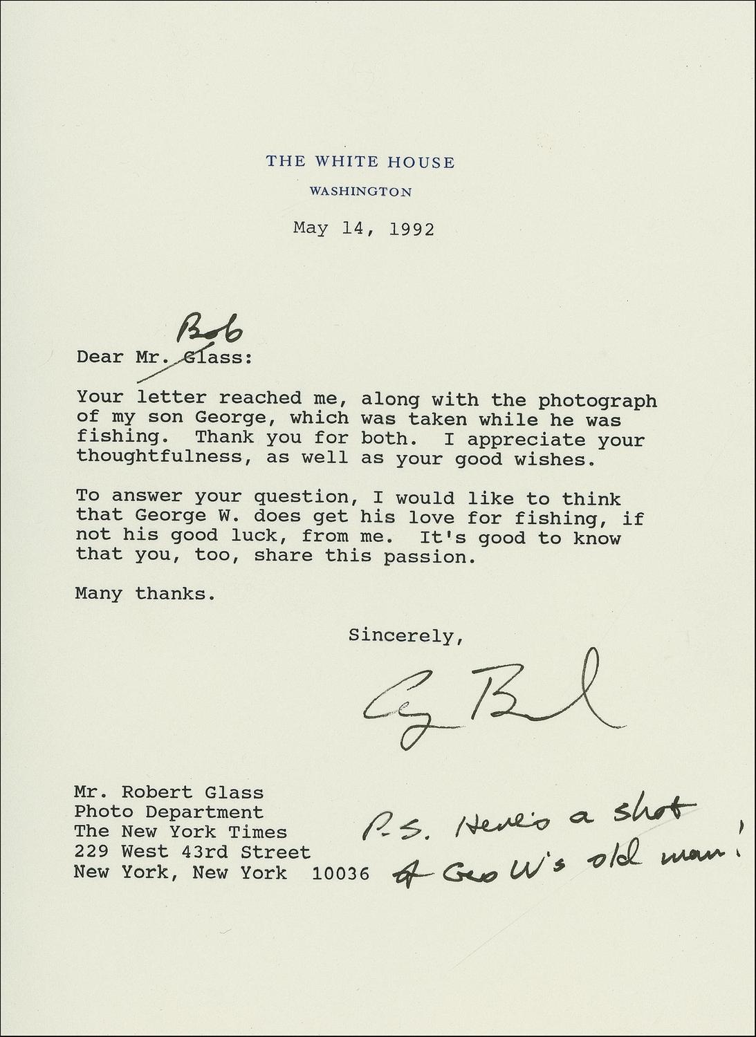 TLS as President, White House letterhead, May 14, 1992. In full: “Your letter reached me, along with the photograph of my son George, which was taken while he was fishing. Thank you for both. I appreciate your thoughtfulness, as well as your good wishes. To answer your question, I would like to think that George W. does get his love for fishing, if not his good luck, from me. It’s good to know that you, too, share this passion. Many thanks.” Bush adds a handwritten postscript: “P.S. Here’s a shot of Geo. W’s old man!,” as well as an informal greeting to “Bob.” Also included is the photo Bush refers to, a color satin-finish 8 x 10 image of himself fishing, signed and inscribed in black felt tip, “To Bob Glass—From one fisherman to another, Best wishes, George Bush, Signed 5–14–92.” In very fine condition, with a few surface impressions to blank margin of photo. Accompanied by an unsigned engraved “The President” card and the original mailing envelope. Bush’s love for fishing is well known, and he still hosts a fishing tournament in Islamorada, an island in the Florida Keys.