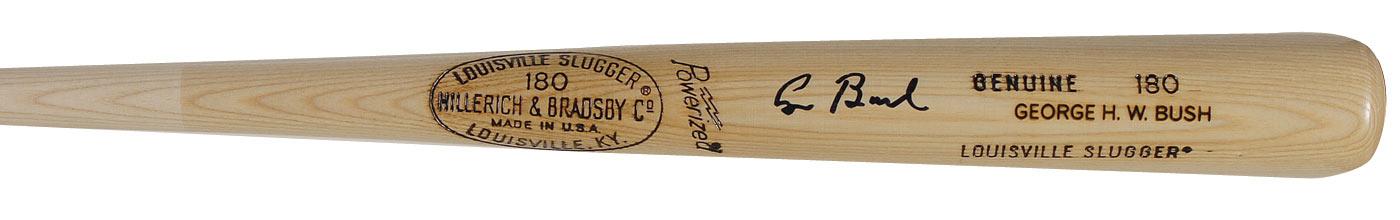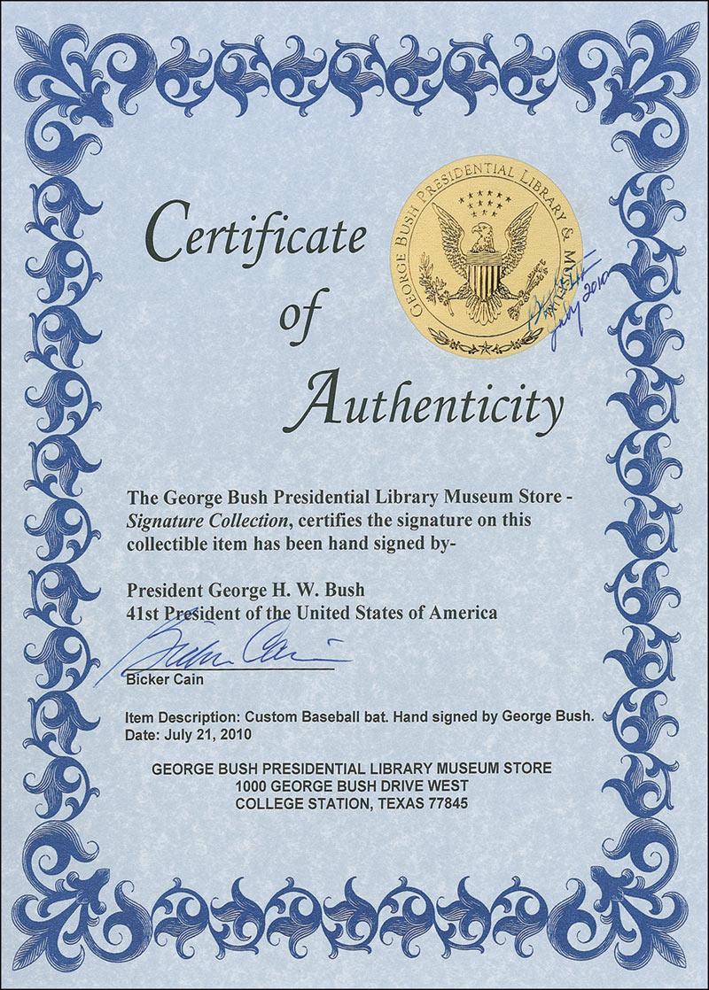 Official Louisville Slugger baseball bat signed in black felt tip on the barrel. In very fine condition. According to the consignor, the bat was recently signed for him by the president in Kennebunkport, Maine. Accompanied by a certificate of authenticity from the George Bush Presidential Library Museum Store, which was specially generated for the consignor as the signed bat ordinarily cannot be purchased from either the presidential foundation or the museum store. Before entering the world of politics, Bush was a Yale first baseman who played in the first two College World Series.