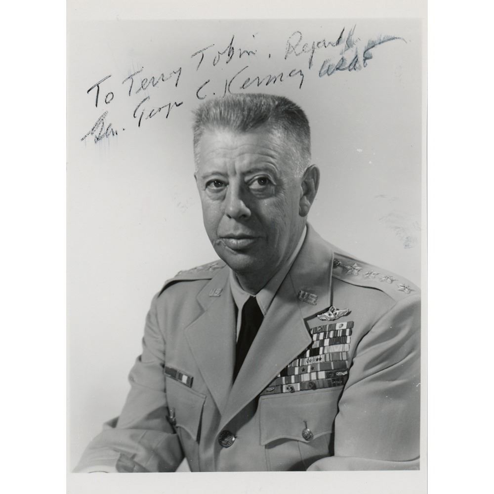 Commander of all Air Forces in the Pacific during World War II (1889–1977). Glossy 3.75 x 5 photo of Kenney in uniform, signed and inscribed in black felt tip, "To Terry Tobin, Regards, Gen. George C. Kenney, USAF.” In fine condition, with some brushing to the ink.
