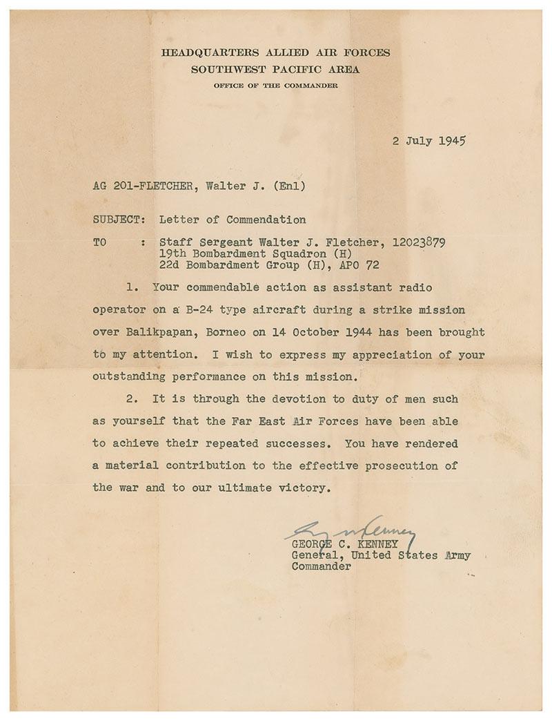Commander of all Air Forces in the Pacific during World War II (1889–1977). War-dated TLS, one page, 8 x 10.5, Headquarters Allied Air Forces Southwest Pacific Area letterhead, July 2, 1945. Letter of commendation to Walter J. Fletcher. In full: “1. Your commendable action as assistant radio operator on a B-24 type aircraft during a strike mission over Balikpapan, Borneo on 14 October 1944 has been brought to my attention. I wish to express my appreciation of your outstanding performance on this mission. 2. It is through the devotion to duty of men such as yourself that the Far East Air Forces have been able to achieve their repeated successes. You have rendered a material contribution to the effective prosecution of the war and to our ultimate victory.” In very good condition, with intersecting folds,one through a single letter of signature, toning, and creases and wrinkles.