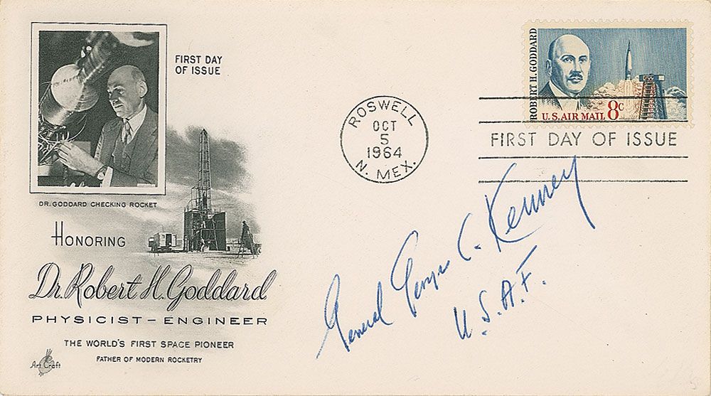 Commander of all Air Forces in the Pacific during World War II (1889–1977). FDC with a cachet honoring Dr. Robert M. Goddard, signed in blue ballpoint, “General George C. Kenney, U.S.A.F.” In fine condition.