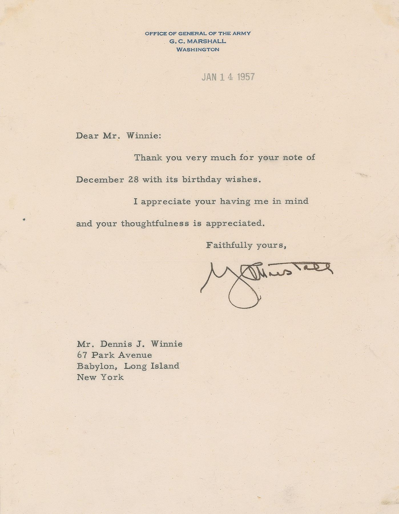 TLS signed “G. C. Marshall,” one page, 7 x 9, personal Office of General of the Army letterhead, January 14, 1957. Letter to Dennis J. Winnie, in full: "Thank you very much for your note of December 28 with its birthday wishes. I appreciate your having me in mind and your thoughtfulness is appreciated." In fine condition, with light stains to the corner tips.