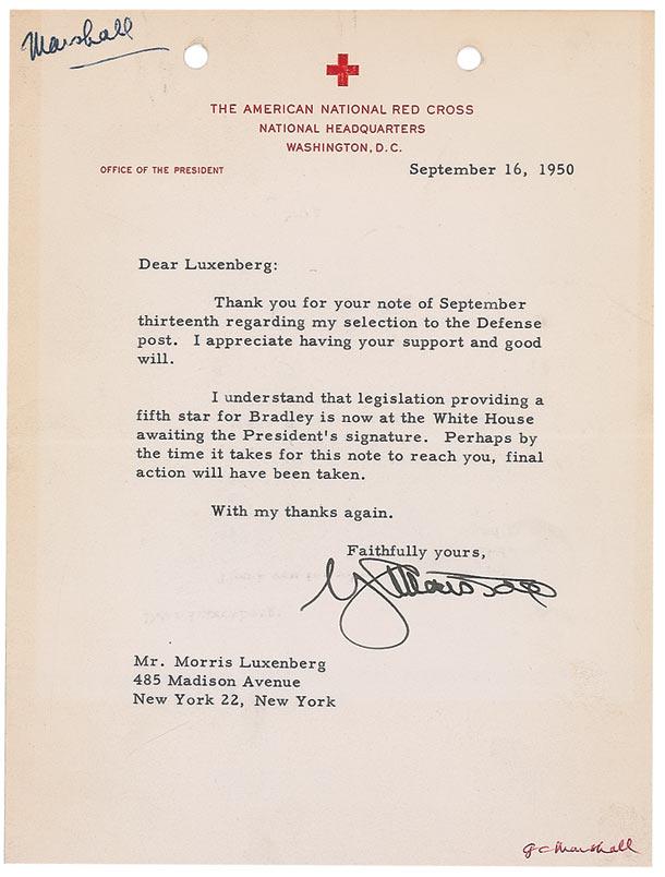 TLS, one page, 6.5 x 8.5, American Red Cross letterhead, September 16, 1950. Marshall writes Morris Luxenberg of New York City regarding Omar Bradley. In part: “I understand that legislation providing a fifth star for Bradley is now at the White House awaiting the President’s signature. Perhaps by the time it takes for this note to reach you, final action will have been taken.” Irregular block of toning, two filing punch holes at the top of the page, two handwritten notations, and a faint paperclip impression at the top of the page, otherwise fine condition.