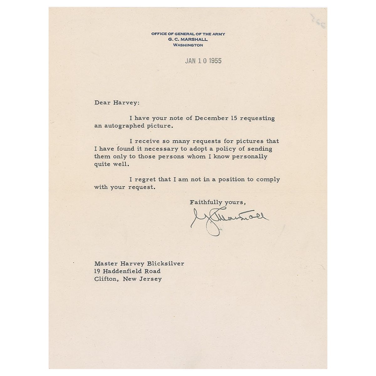 TLS signed “G. C. Marshall,” one page, 7 x 9, Office of General of the Army letterhead, January 10, 1955. In a letter to Harvey Blicksilver, Marshall writes, in part: “I receive so many requests for pictures that I have found it necessary to adopt a policy of sending them only to those persons whom I know personally quite well. I regret that I am not in a position to comply with your request.” In fine condition, with a faint paperclip impression at the top left corner.