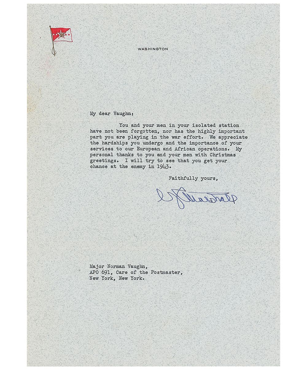 TLS signed “G. C. Marshall,” one page, 7.25 x 10.25, Chief of Staff of the Army letterhead, circa December 1942. Letter to Norman D. Vaughan, a dogsled driver who, at the time, was helping the army with search and rescue missions in Greenland. In full: “You and your men in your isolated station have not been forgotten, nor has the highly important part you are playing in the war effort. We appreciate the hardships you undergo and the importance of your services to our European and African operations. My personal thanks to you and your men with Christmas greetings. I will try to see that you get your chance at the enemy in 1943.” In fine condition, with some light soiling to the upper left. Accompanied by the original envelope, stamped “Confidential.” Vaughan had explored Antarctica with Richard E. Byrd during his 1928–1932 expedition, and ultimately attained the rank of colonel as a search and rescue dogsled driver during WWII—his feats included the organization of dogsled evacuation for wounded soldiers during the Battle of the Bulge and retrieval of the top-secret Norden bombsight from a downed plane in enemy territory. A great letter associating two military men who dared to think outside the box.