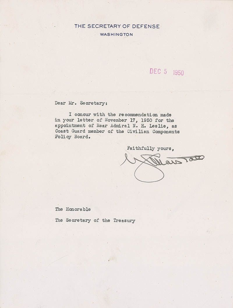 TLS signed “G. C. Marshall,” one page, 7 x 9.25, Secretary of Defense letterhead, stamp-dated December 5, 1950. Letter to the Secretary of the Treasury. In part: “I concur with the recommendation…for the appointment of Rear Admiral N. H. Leslie, Coast Guard member of the Civilian Components Policy Board.” In fine condition, with a bit of scattered light soiling.