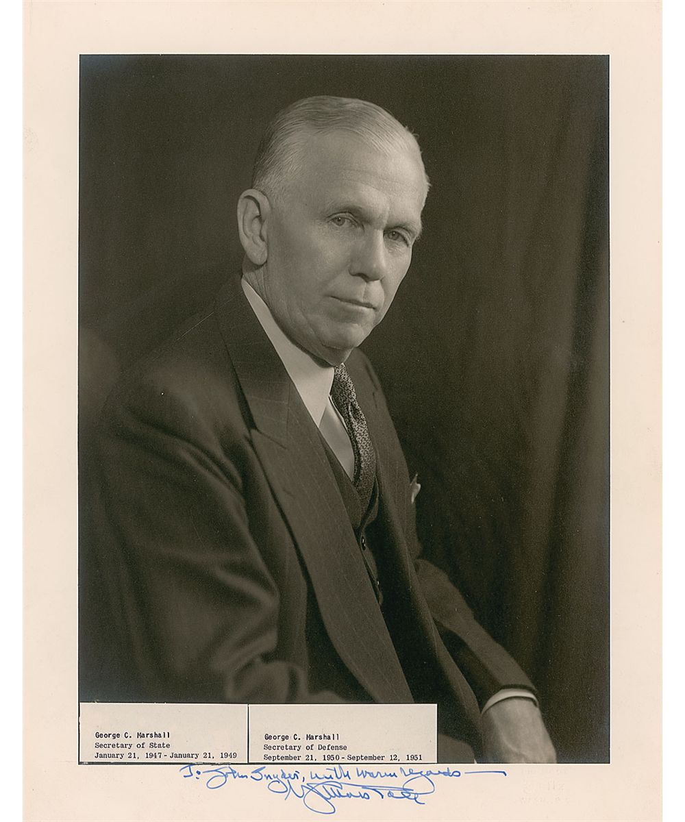 Vintage matte-finish 10.75 x 13.75 photo by Waltz of Washington, D. C., signed and inscribed in the lower border in fountain pen “To John Snyder, with warm regards, G. C. Marshall.” In fine condition, with a caption affixed to bottom of image, some light bends and creases, and a bit of scattered light silvering.