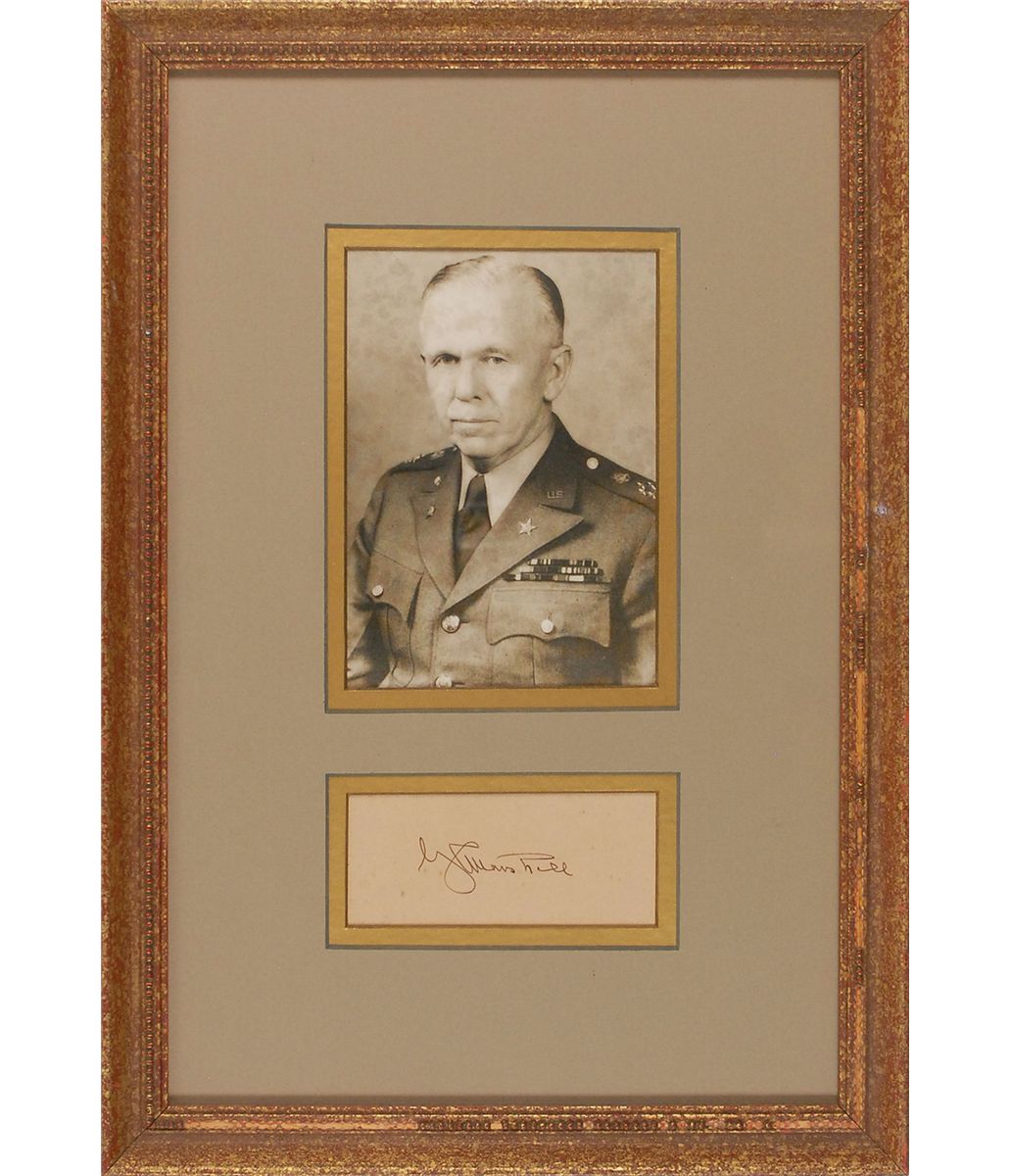 Vintage ink signature, “G. C. Marshall,” on an off-white slip. Double-matted and framed with a portrait of Marshall in uniform to an overall size of 11.5 x 17. In fine condition, with a bit of trivial foxing.