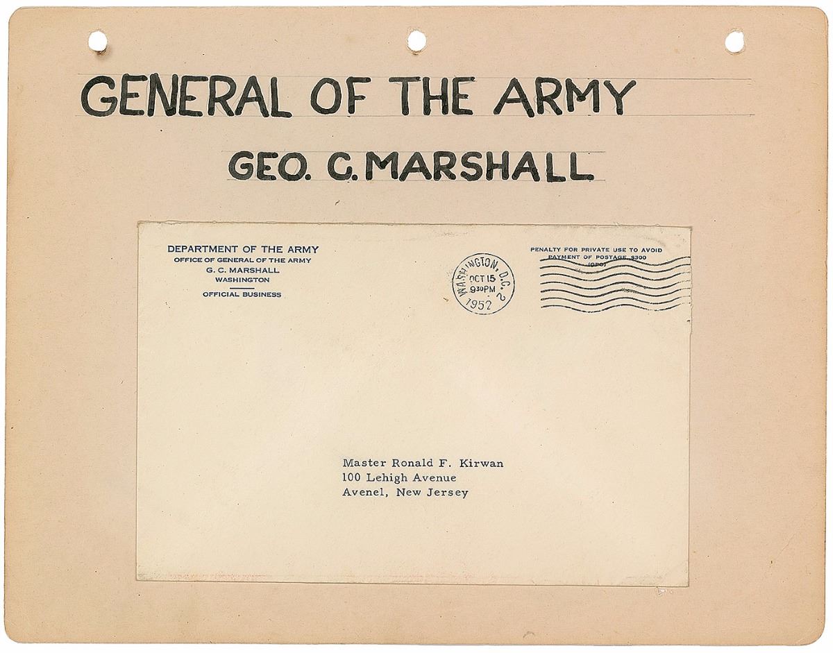 TLS signed “G. C. Marshall,” one page, 7 x 8.75, Office of the General of the Army letterhead, October 15, 1952. Letter to Ronald F. Kirwan. In full: “Your note of October 2 was on my desk today upon my return from a trip to Europe. I am glad to contribute to your autograph collection and hope that the signature below will serve your purpose.” In fine condition, with a trivial stain to the right edge. Accompanied by the original mailing envelope affixed to a scrapbook page.