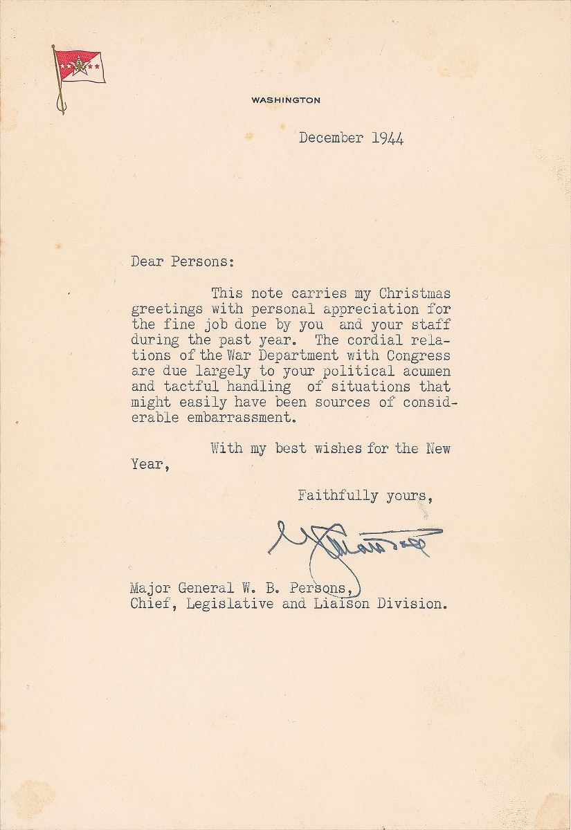 World War II-dated TLS signed “G. C. Marshall,” one page, 7 x 10.25, Chief of Staff of the United States Army letterhead, December 1944. Letter to Major General W. B. Persons, in full: "This note carries my Christmas greetings with personal appreciation for the fine job done by you and your staff during the past year. The cordial relations of the War Department with Congress are due largely to your political acumen and tactful handling of situations that might easily have been sources of considerable embarrassment." In fine condition, with scattered light staining in blank areas. Pre-certified PSA/DNA.