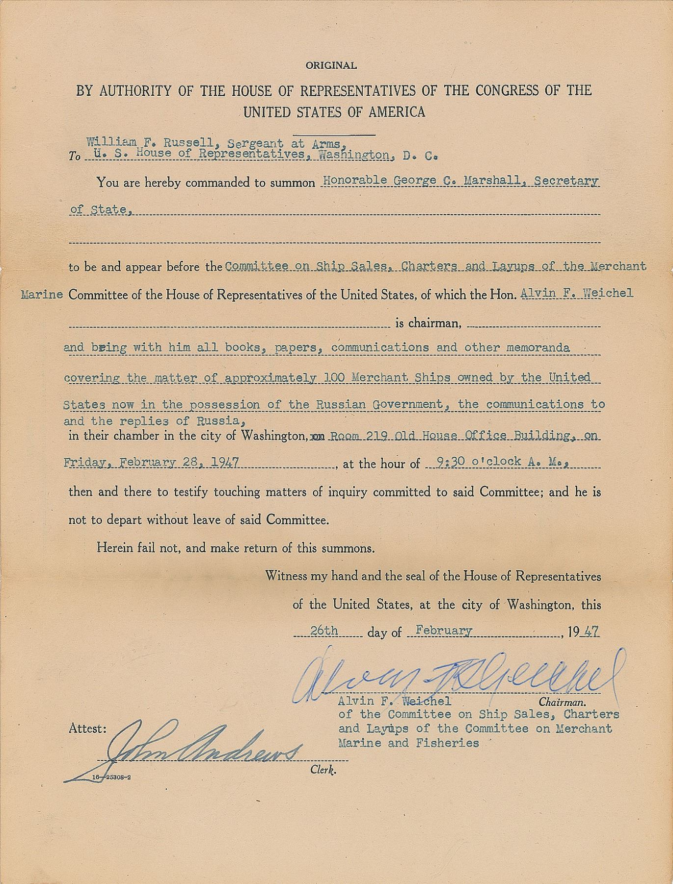 DS, one page, 8 x 10.5, February 26, 1947. Official Congressional order issued to William F. Russell to summon "Honorable George C. Marshall, Secretary of State, to be and appear before the Committee on Ship Sales, Charters and Layups of the Merchant Marine Committee of the House of Representatives of the United States…and bring with him all books, papers, communications and other memoranda covering the matter of approximately 100 Merchant Ships owned by the United States now in the possession of the Russian Government, the communications to and the replies of Russia…on Friday, February 28, 1947." Signed at the conclusion by Alvin F. Weichel. In fine condition, with light toning along mailing folds.