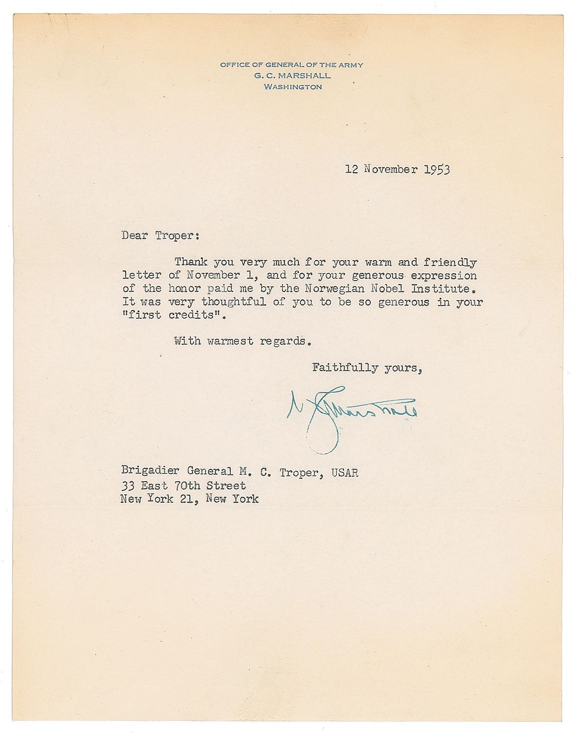 Notable TLS signed “G. C. Marshall,” one page, 7 x 9, Office of General of the Army letterhead, November 12, 1953. Letter to Brigadier General M. C. Troper, in full: "Thank you very much for your warm and friendly letter of November 1, and for your generous expression of the honor paid me by the Norwegian Nobel Institute. It was very thoughtful of you to be so generous in your 'first credits.' In fine condition, with faint edge toning. Accompanied by the original mailing envelope. Marshall's ambitious plan for rebuilding Europe in the aftermath of World War II earned him the Nobel Peace Prize on December 10, 1953, making him the only career officer in the United States Army to ever receive this honor.