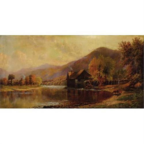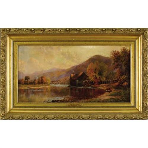 <B>GEORGE C. PEDRICK </B></I>(American Nineteenth Century)<BR><I>The Old Mill</B></I>, 1891<BR>Oil on original unlined canvas<BR>12-1/4 x 14-1/4 inches (31.1 x 36.2 cm)<BR>Signed and dated lower left: <I>Geo. C. Pedrick 1891</B></I><BR> <B>Condition Report:</B> Very good condition. Three small canvas patches verso.<BR><BR><b>Shipping:</b> Requires 3rd Party Shipping (<a target="_blank" href="http://www.heritageauctions.com/common/shipping.php">view shipping information</a>)