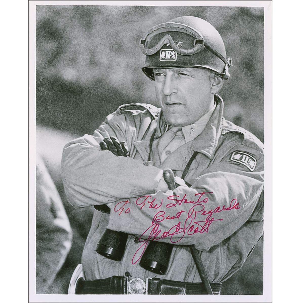 Glossy 8 x 10 photo of Scott as Patton, signed and inscribed in red felt tip “To the Stouts, Best regards, George C. Scott.” In fine condition.