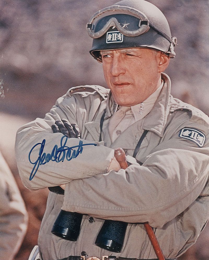 Color glossy 8 x 10 photo of Scott as General George C. Patton, signed in blue felt tip. In very fine condition.