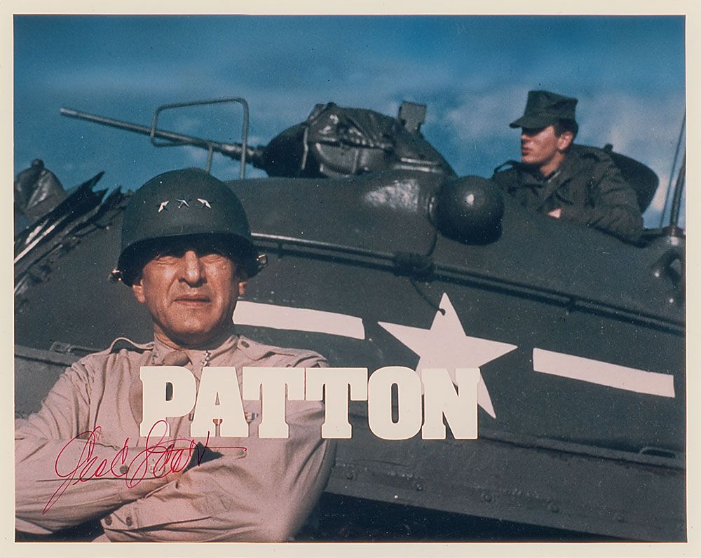 Color glossy 10 x 8 photo of Scott as General George Patton posing in front of a tank, signed in red felt tip. In fine condition.