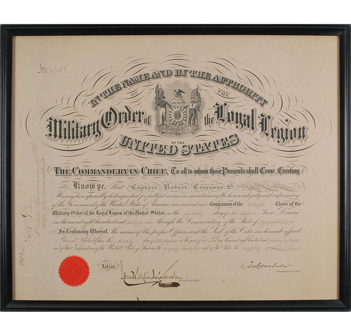 Army general (1806–1879) in the Mexican-American and Civil War. Partly-printed DS, signed “Geo. Cadwalader,” one page, 21.5 x 17.5, November 6, 1872. Official certificate issued to Captain Robert Crossman 2nd for his “faithful services in maintaining the honor, integrity and supremacy of the Government of the United States of America was received as a Companion of the First Class of the Military Order of the Loyal Legion of the United States.” Signed at the conclusion by Cadwalader. Crisp red seal affixed to lower left remains fully intact. Framed to an overall size of 23 x 19. In fine condition, with scattered creases.