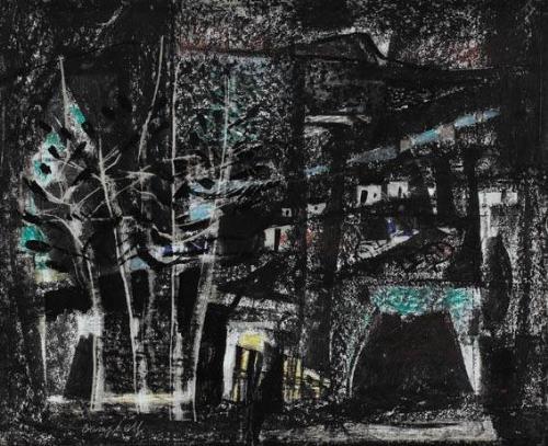 <B>George Campbell RHA (1917-1979)</B><BR>SPANISH MOUNTAIN VILLAGE AT NIGHT<BR>signed lower left; exhibition label on reverse<BR>crayon and ink on paper<BR>27 by 32cm., 10.5 by 12.5in.<BR>Provenance:<BR>Frederick Gallery, Dublin; Private collection