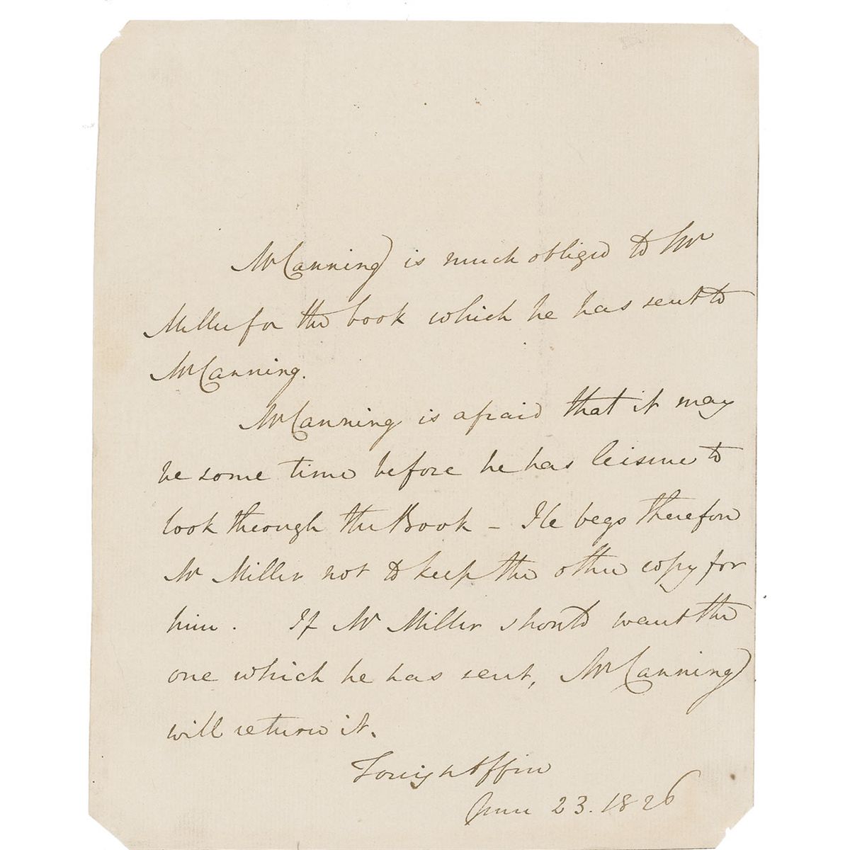 British statesman and politician (1770–1827) who served as Foreign Secretary and briefly Prime Minister. Third-person ALS, one page, 7.25 x 9, June 23, 1826. Letter reads, in part: “Mr. Canning is much obliged to Mr. Miller for the book which he has sent to Mr. Canning. Mr. Canning is afraid that it may be some time before he has leisure to look through the book.” In fine condition, with intersecting mailing folds, some scattered light toning, and clipped corner tips.