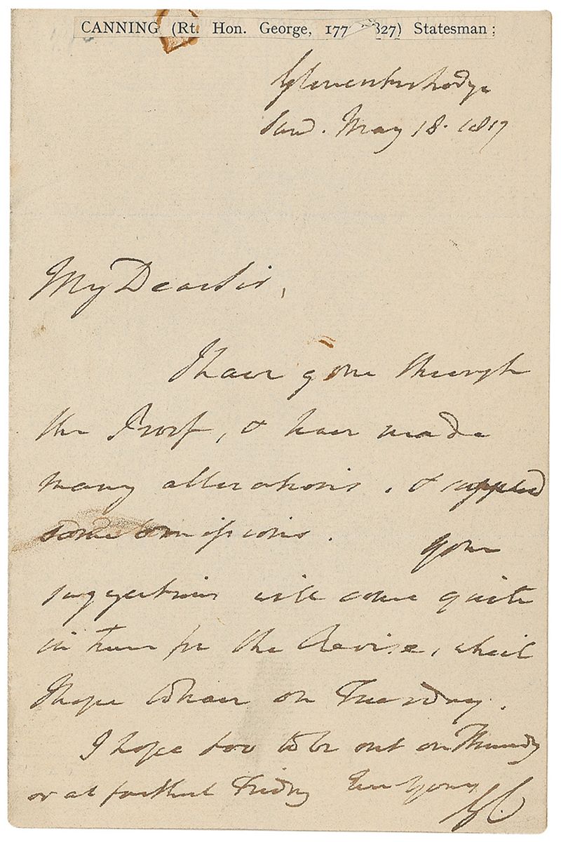 British statesman and politician (1770–1827) who served as Foreign Secretary and briefly Prime Minister. ALS signed “G. C.,” one page, 4.5 x 7, May 18, 1817. Letter to a gentleman. In part: “I have gone through the proof, & have made many alterations, & supplied some omissions.” In very good condition, with a few mild creases, scattered toning and soiling, typed caption affixed to the top, and some slight brushing to ink.