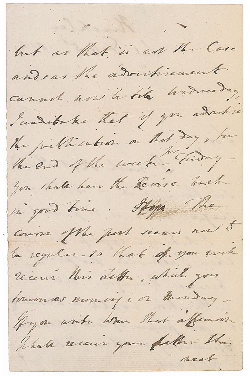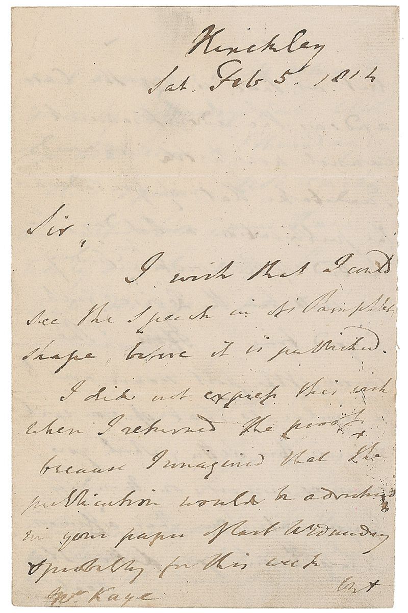 British statesman and politician (1770–1827) who served as Foreign Secretary and briefly Prime Minister. ALS signed “Geo. Canning,” three pages on two adjoining sheets, 5 x 7.75, February 5, 1814. Letter to a gentleman. In part: “I wish that I could see the speech in its pamphlet shape before it is published.” Scattered brushes to ink and a small area of paper loss to top of second integral sheet (affecting no text), otherwise fine condition.