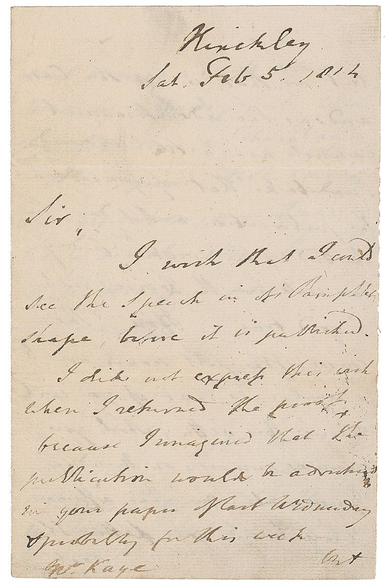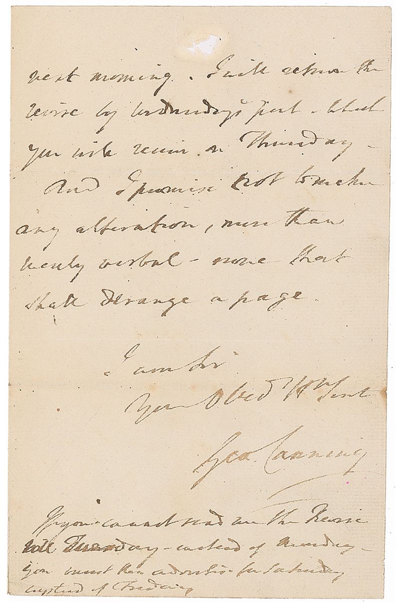 British statesman and politician (1770–1827) who served as Foreign Secretary and briefly Prime Minister. ALS signed “Geo. Canning,” three pages on two adjoining sheets, 5 x 7.75, February 5, 1814. Letter to a gentleman. In part: “I wish that I could see the speech in its pamphlet shape before it is published.” Scattered brushes to ink and a small area of paper loss to top of second integral sheet (affecting no text), otherwise fine condition.