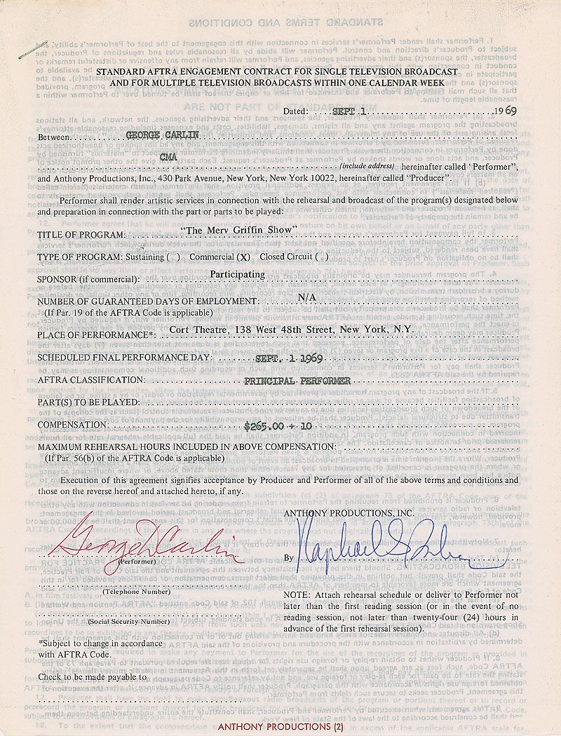DS, one page, 8.5 x 11, September 1, 1969. Standard AFTRA contract in which Carlin agrees to appear on The Merv Griffin Show on the same day in exchange for $265 plus a 10% agency commission. Signed at the conclusion in red ballpoint by Carlin, “George D. Carlin.” A standard AFTRA rider is stapled to the main document in the upper left. In fine condition, with expected document wear.
