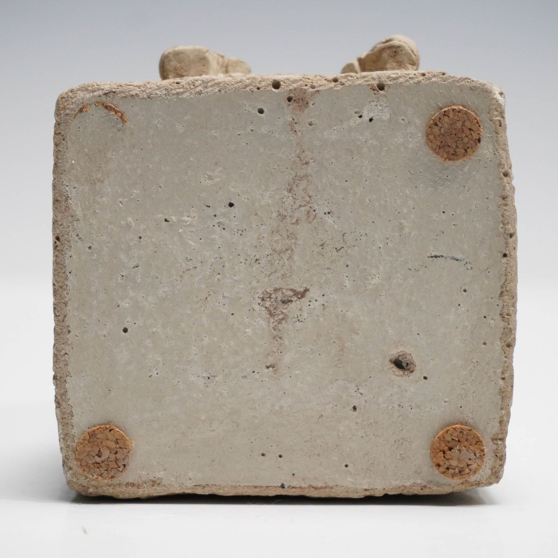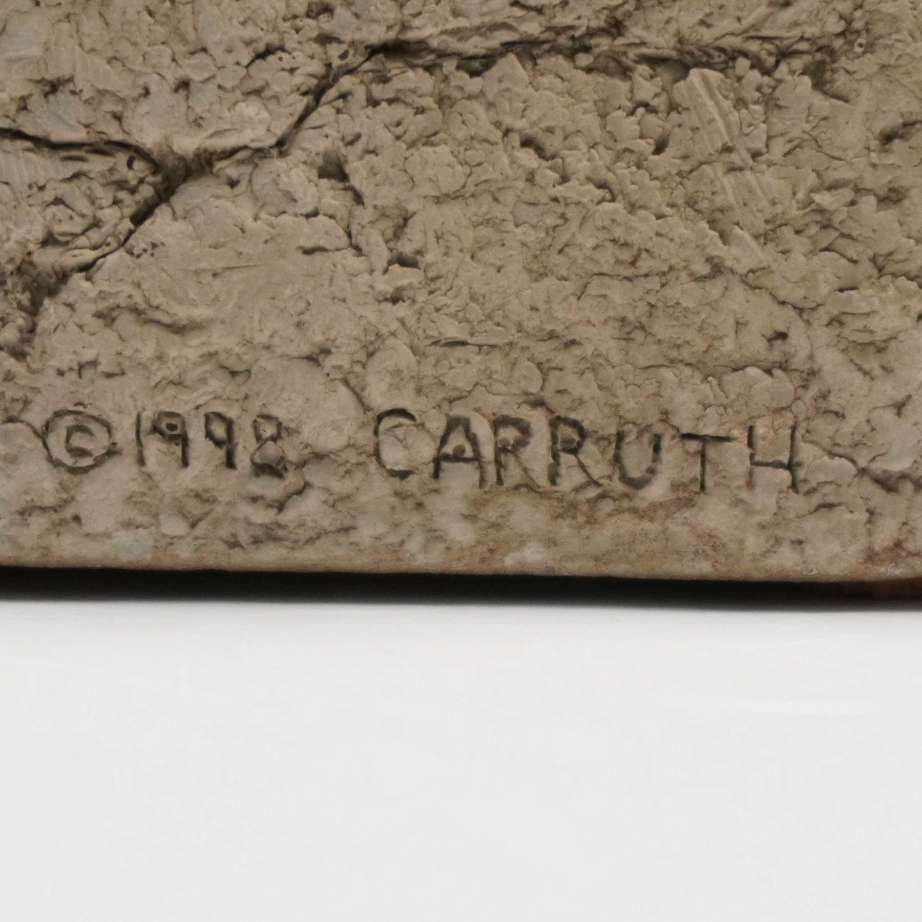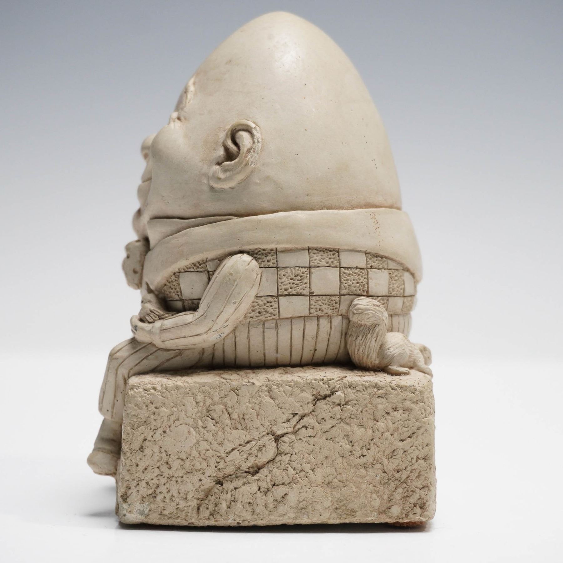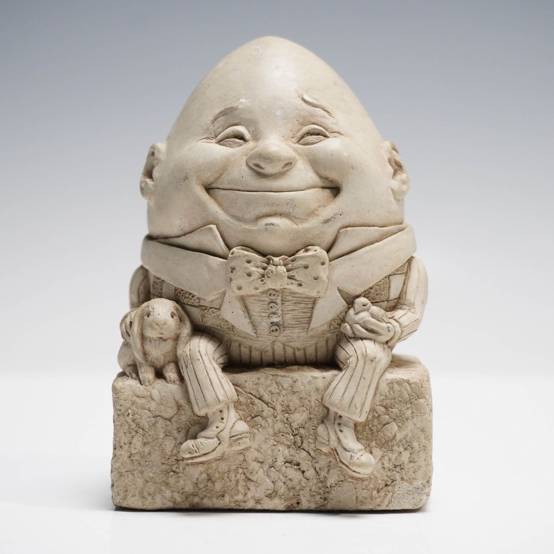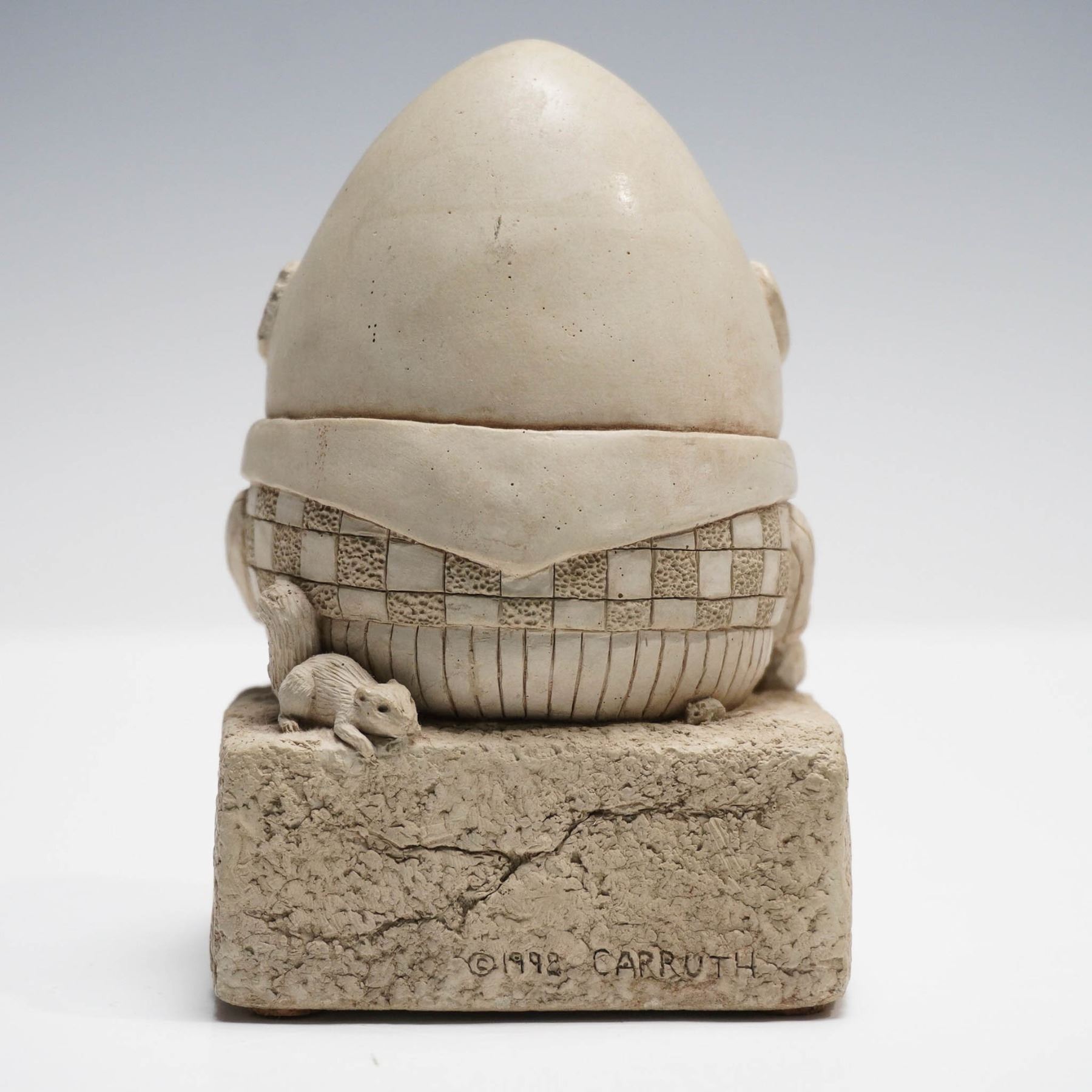 Whimsical cast stone sculpture by artist George Carruth, signed and dated 1998 on the reverse. The piece features a charming interpretation of Humpty Dumpty, complete with a bow tie, suspenders, and striped trousers, sitting atop a textured block alongside a dog, a squirrel, and a small bird. Carruth's signature style shines through in the joyful expression and finely textured detailing. Known for his imaginative garden and home sculptures, Carruth has been creating collectible art pieces since the 1980s.