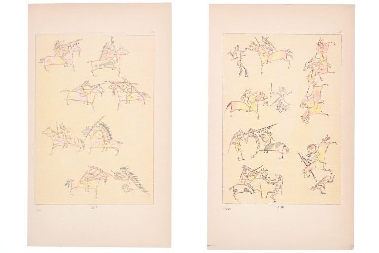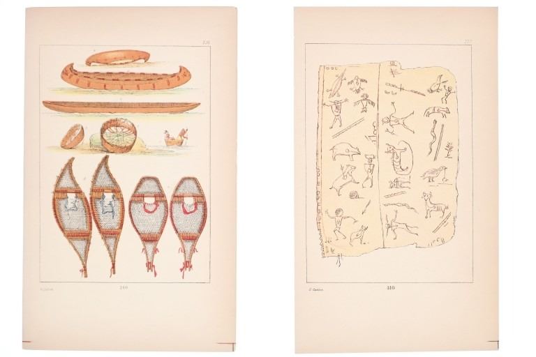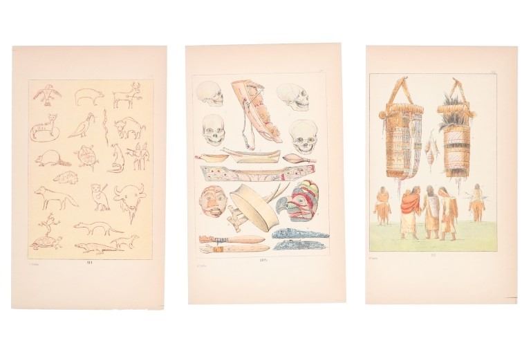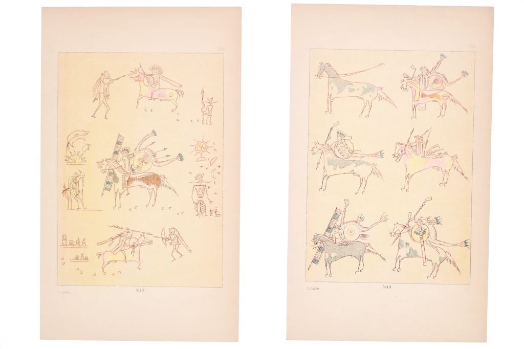 Featured in this lot are nine 19th-Century, hand tinted George Catlin (1796-1872) etchings of Native American pictorial drawings and illustration plates, from "Illustrations of the Manners, Customs & Condition of the North American Indians With Letters and Notes, Written During Eight Years of Travel and Adventure Among The Wildest and Most Remarkable Tribes Now Existing" by George Catlin 1841. George Catlin (1796–1872) was a 19th-century American painter, author, and traveler who famously abandoned a legal career to document Native American life, creating over 500 paintings known as his "Indian Gallery". Driven by a desire to preserve the appearance and customs of what he termed a "vanishing race," Catlin traveled extensively through the American West in the 1830s, visiting over 48 tribes. The etchings show six, Native American pictograph plates and three illustration plates with one showing Native American bags and/or papoose, the second showing ceremonial masks, drums, a papoose, skulls and dance sticks with the third showing snow shoes and canoes. They show the plate number at the bottom and the page number in the top right. The bottom left reads, "G. Catlin". The plates included are as follows: 210 1/2, 232, 240, 306, 307, 308, 309, 310 and 311. They shows golt gilt edges on the top and rough cuts as they were taken from one of the editions of books. They show good condition overall with little wear present and no signs of damage noted. The visible art measures 6 7/8" L x 5" W, while the entire piece measures 9 7/8" L x 5 7/8" W. They have a collective weight of under 6 ounces.