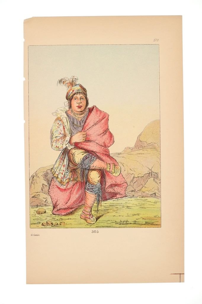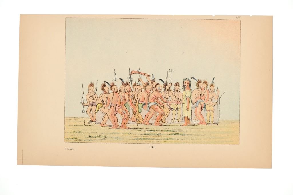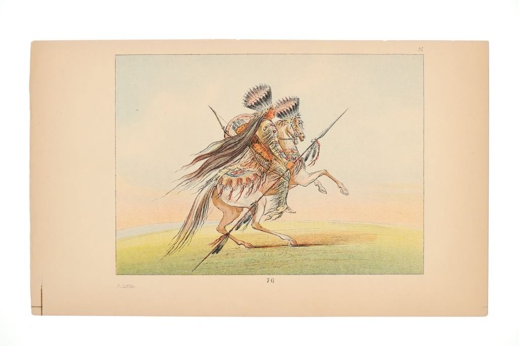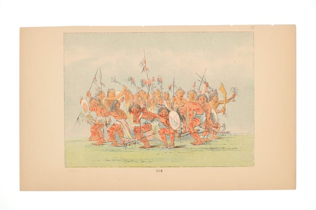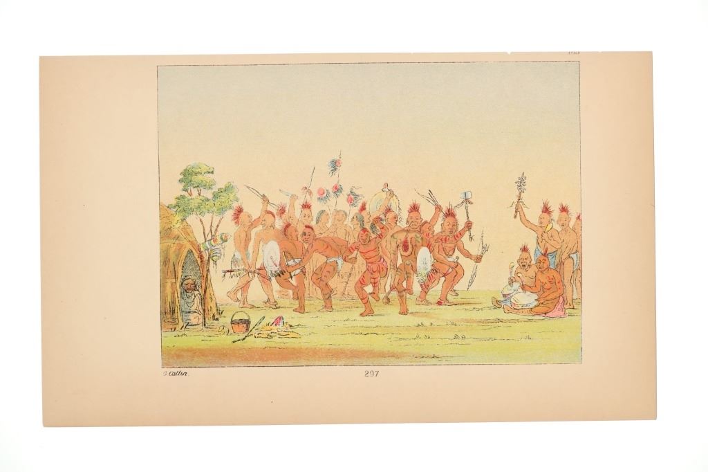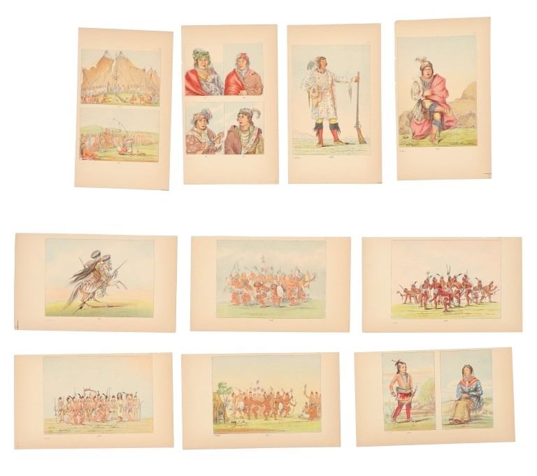 Featured in this lot are ten George Catlin lithographs from "George Catlin's North American Indians, Volume 1" circa 1926. George Catlin (1796-1872) was an American adventurer, lawyer, painter, author, and traveler, who specialized in portraits of Native Americans in the Old West. Traveling to the American West five times during the 1830s, Catlin wrote about and painted portraits that depicted the life of the Plains Indians. From 1832 to 1837, Catlin spent summers (and one winter) traveling with and documenting the life of Native Americans from the Sioux (Lakota), Blackfeet, Crow, Mandan and other tribes. With the advent of railroads, Catlin saw that American culture was moving from the East Coast toward the West and knew that the Native Americans way of life likely would drastically change as development reached them. He would sketch while out with the tribes and then return to his studio in the winter to add color. This lot includes ten colored lithographs from the book titled, "North Americans Indians: Vol. 1". They are numbered and feature Catlin's name on the bottom in black lettering reading, "G. Catlin". They show various Native Americans and scenes such as He Who Jumps Over Everyone, sun dances, the scalp dance and more. They show good condition overall with slight wear present from their age and handling over the years, but no signs of major damage are noted. They measure 6" L x 9 7/8" W, with a collective weight of under 6 ounces.