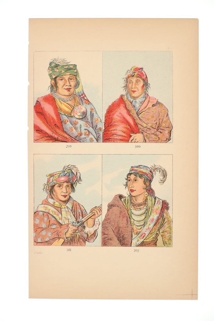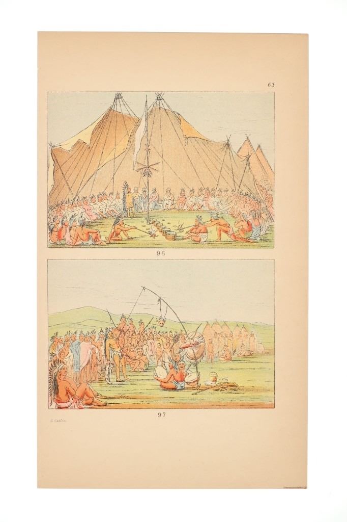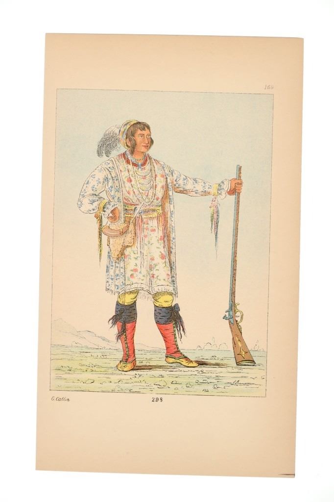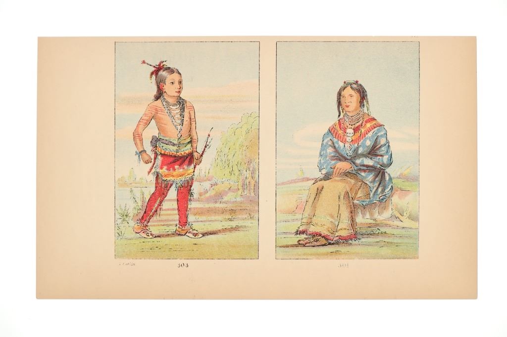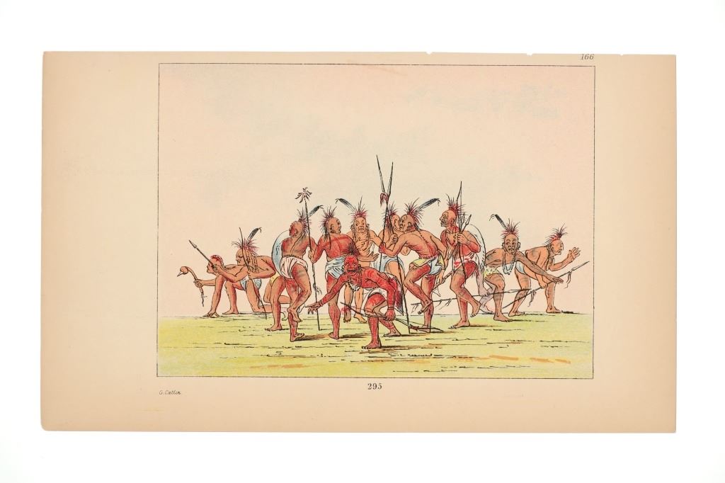 Featured in this lot are ten George Catlin lithographs from "George Catlin's North American Indians, Volume 1" circa 1926. George Catlin (1796-1872) was an American adventurer, lawyer, painter, author, and traveler, who specialized in portraits of Native Americans in the Old West. Traveling to the American West five times during the 1830s, Catlin wrote about and painted portraits that depicted the life of the Plains Indians. From 1832 to 1837, Catlin spent summers (and one winter) traveling with and documenting the life of Native Americans from the Sioux (Lakota), Blackfeet, Crow, Mandan and other tribes. With the advent of railroads, Catlin saw that American culture was moving from the East Coast toward the West and knew that the Native Americans way of life likely would drastically change as development reached them. He would sketch while out with the tribes and then return to his studio in the winter to add color. This lot includes ten colored lithographs from the book titled, "North Americans Indians: Vol. 1". They are numbered and feature Catlin's name on the bottom in black lettering reading, "G. Catlin". They show various Native Americans and scenes such as He Who Jumps Over Everyone, sun dances, the scalp dance and more. They show good condition overall with slight wear present from their age and handling over the years, but no signs of major damage are noted. They measure 6" L x 9 7/8" W, with a collective weight of under 6 ounces.