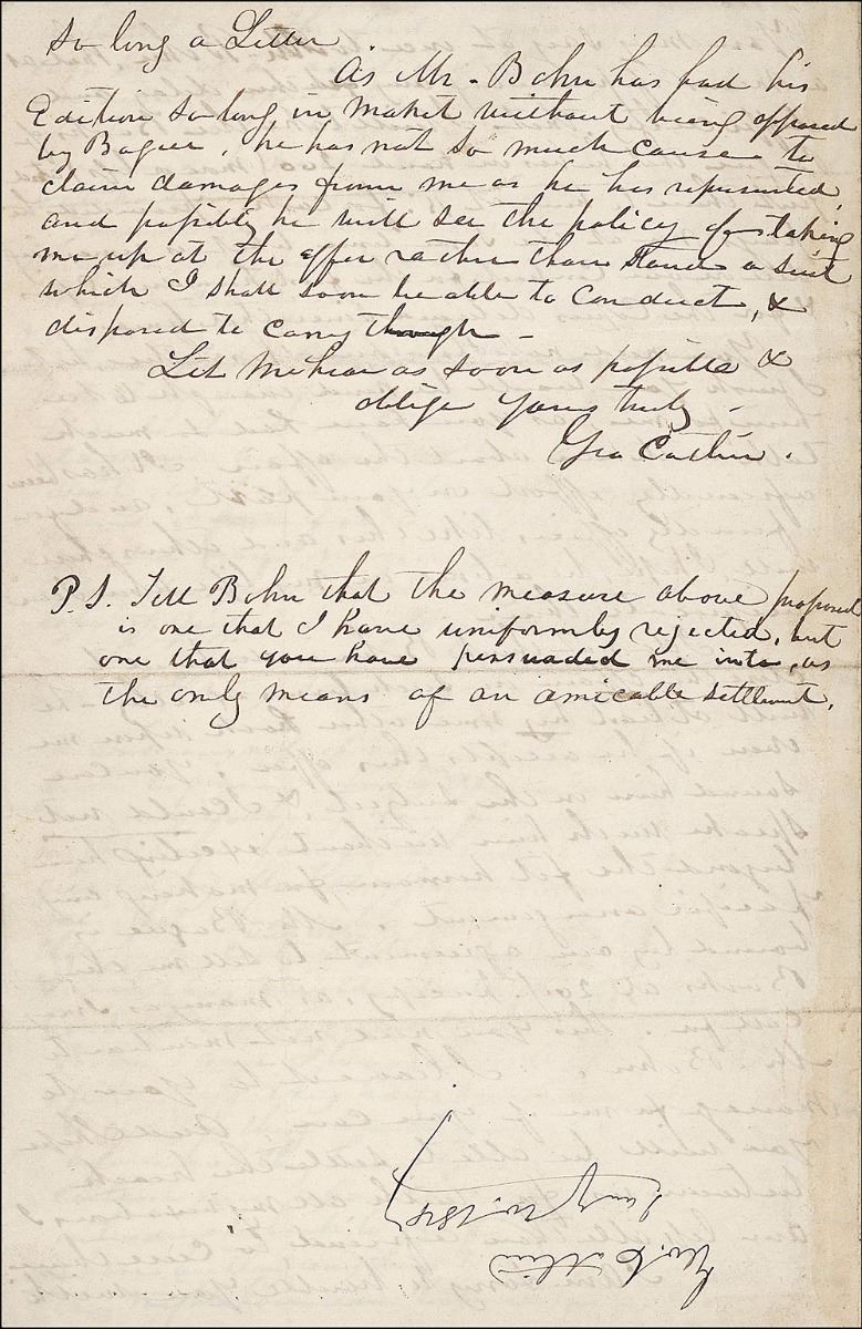 American artist, author, and traveler (1796–1872) best known for his Indian Gallery, a monumental collection of paintings documenting the quickly vanishing customs, costumes, and cultures of various Native American peoples in their natural environment. ALS signed “Geo. Catlin,” four pages on two adjoining sheets, 5.25 x 8, January 20, 1847. Lengthy letter to Putnam, his New York publisher, concerning several legal issues. In part: “I am extremely vexed that the box with the picture should have been so long on the way to London making its arrival so late in Washington. I was assured by the agent here that it would be delivered to you in 36 hours. The Lawyer’s Letter with account of costs is even more entirely unexpected & vexatious. I never gave him any authority to arrest Mr. Burrows or even to commence a suit against him…I intended…to have the account presented by an attorney in such a form as to alarm him…I never sued a man in my life before this and this has been done entirely without my knowledge…I never would have arrested or imprisoned the old man for 5 times the amount…It hurts me to think that the old man was arrested & imprisoned at my suit, as I never intended to imprison any friend or foe in my life…In the affair with Bohn…they have held back, putting a certain price upon their Books, and I believe, intending to look to me for their value rather than outlay anything…You may say at once to Mr. Bohn that as a means of preventing any further delay and difficulty, that I will take the Books…for cash, provided he pays me at the same time what is remaining due on our contract for the first hundred copies & for the copies delivered since that time.” In fine condition.